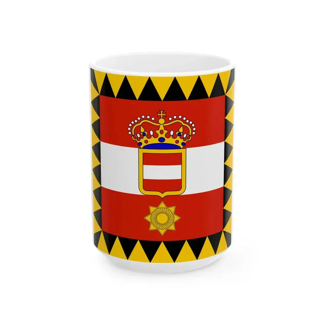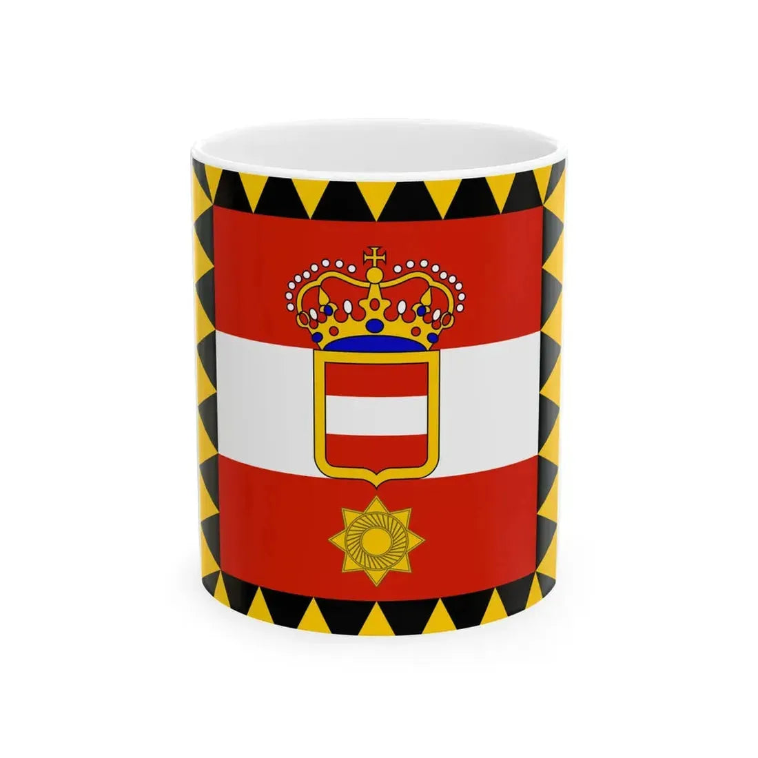 This Habsburg Rear Admirals Flag mug showcases a unique design inspired by the historic naval insignia of Austria during the Habsburg dynasty. The white coffee mug displays the iconic flag, featuring a black double-headed eagle with outstretched wings and the Imperial Crown on its head. This design is perfect for history enthusiasts, particularly those interested in maritime history or the Habsburg Empire.