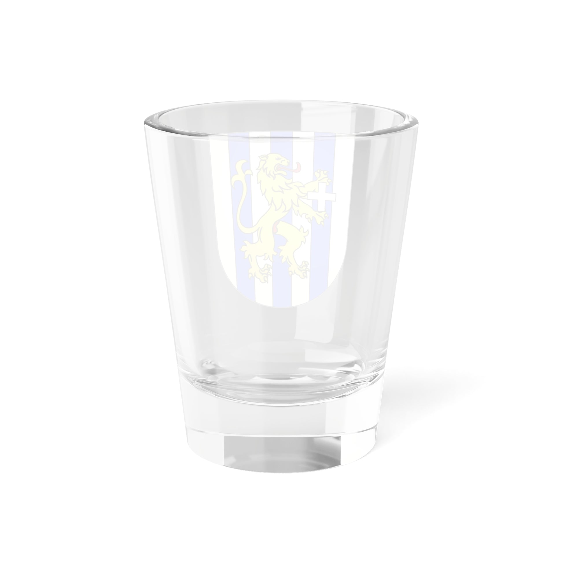 This shot glass showcases the official coat of arms of Hauterive, a municipality in the canton of Fribourg, Switzerland. The design elegantly blends elements from the former communes of Posieux and Ecuvillens, representing their shared history and the unity of the new municipality.