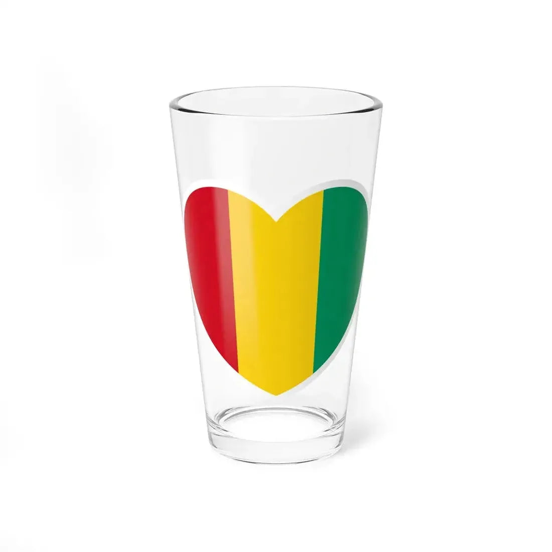 The Heart Flag of Guinea Pint Glass is a unique piece of drinkware that showcases the national symbol of Guinea in an eye-catching design. This pint glass, holding 16oz, features the distinctive heart shape of the Guinean flag, symbolizing unity and love among its people. The bold red color at the top and bottom segments represents bravery and valor, while the white middle segment signifies peace and honesty. This glass is perfect for anyone who appreciates unique and cool drinkware, as well as those with an affinity towards Guinean culture or West African art.