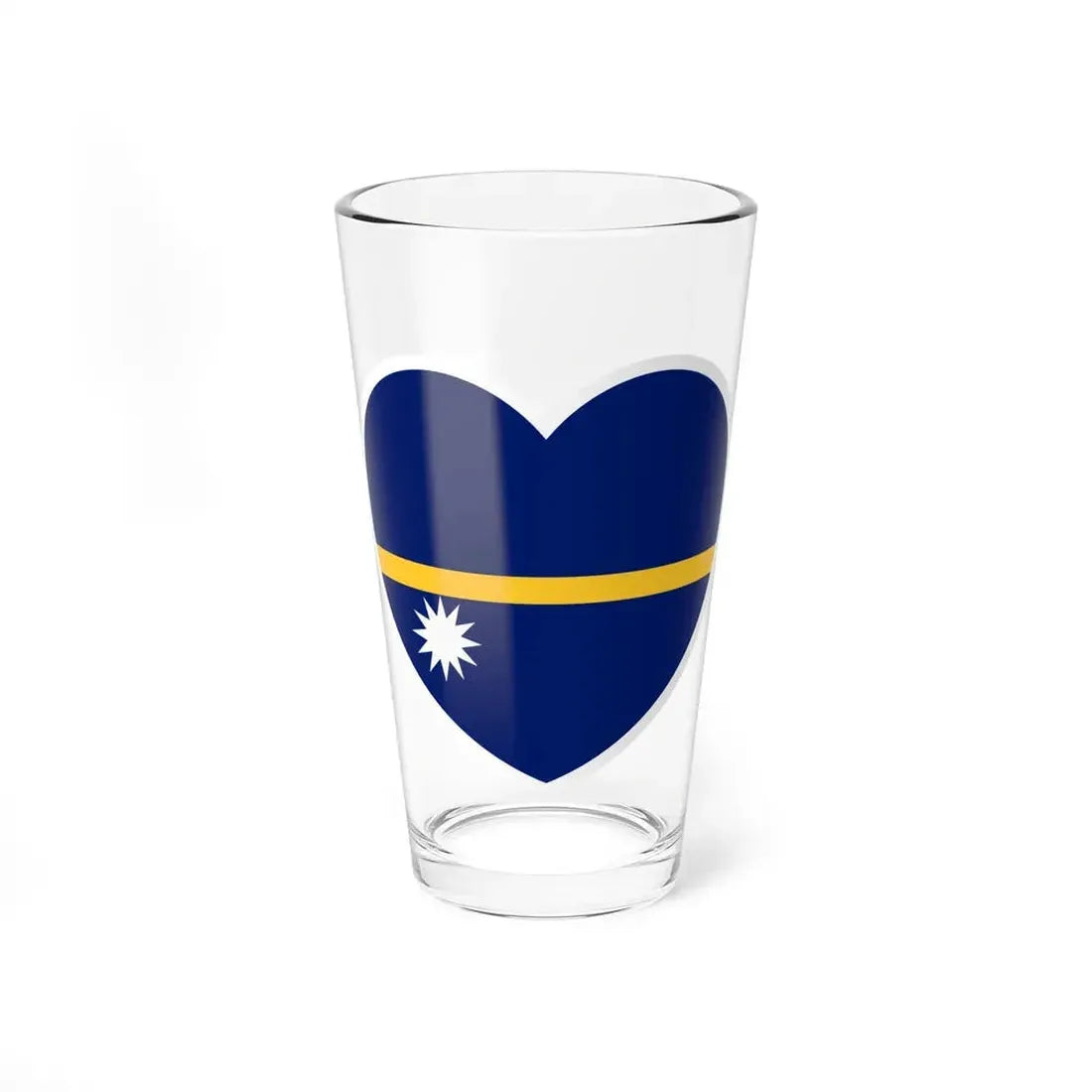 The Heart Flag of Nauru Pint Glass is a unique drinkware item that showcases the national flag of the Republic of Nauru in a heart shape. This design symbolizes both love for one's country and the unique identity of this Micronesian island nation. The Heart Flag of Nauru features three equal horizontal bands of white, red, and blue, with a large yellow five-pointed star positioned near the hoist side (left) and extending to the edge of the heart. This design, adopted in 1960, reflects the country's history and cultural heritage.