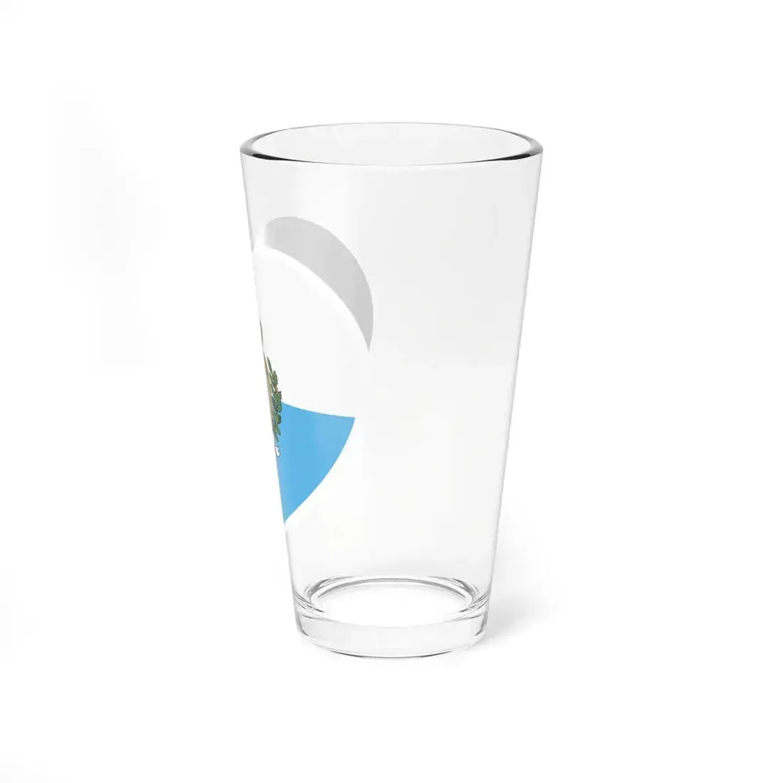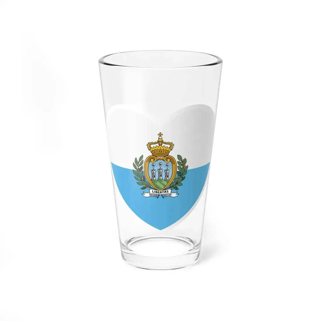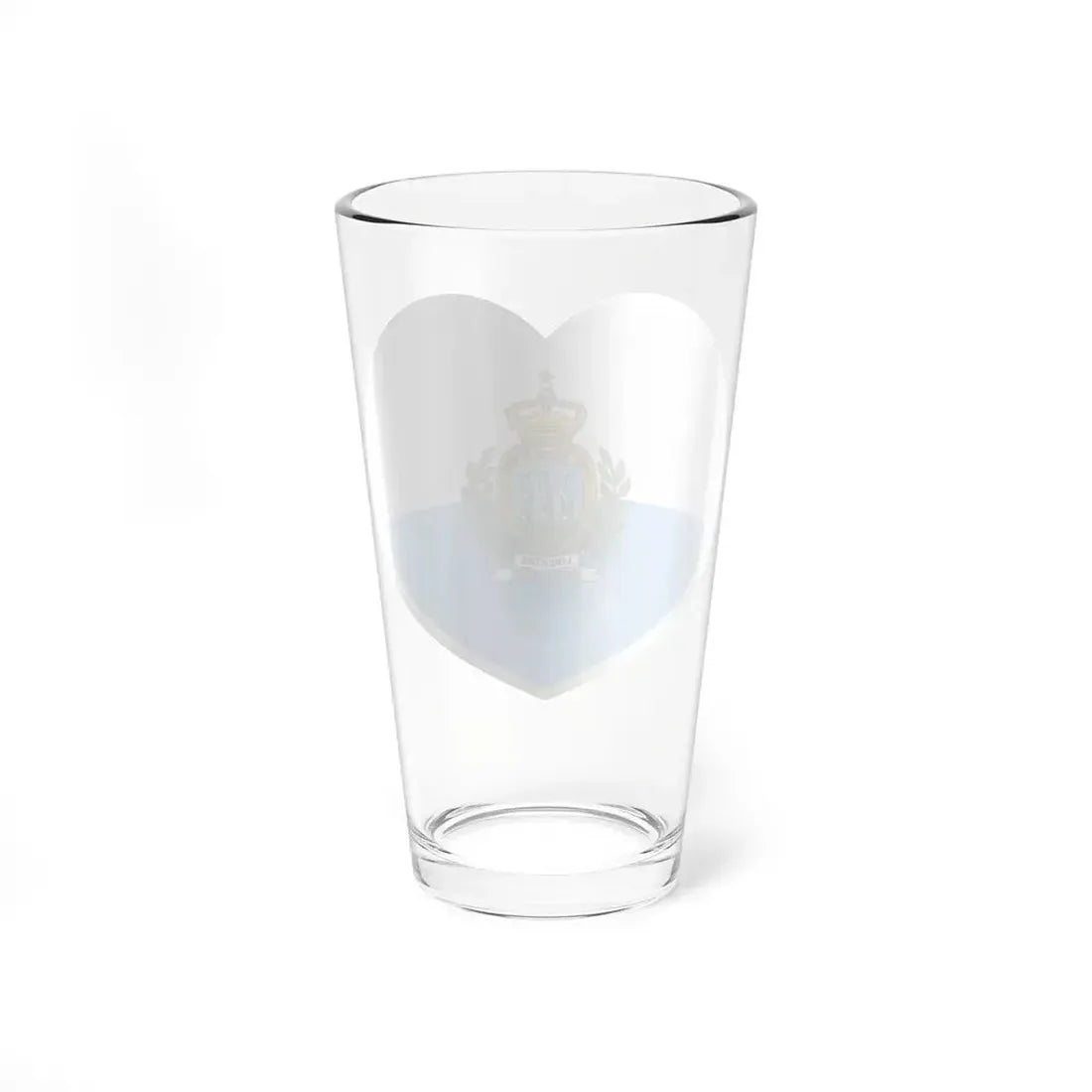 The Heart Flag of San Marino Pint Glass is a unique piece of drinkware that showcases the national symbol of one of the oldest republics in the world, San Marino. This 16oz glass proudly displays the heart-shaped design of the San Marino flag, which consists of three equal vertical bands of white (hoist side), dark green, and light blue. The design is a testament to the country's history and its unique identity as an enclave surrounded by Italy.