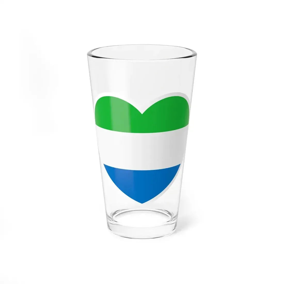 The Heart Flag of Sierra Leone Pint Glass, with a capacity of 16 oz, showcases a unique representation of the national flag in a drinkware form. Originally adopted on April 27, 1961, the Sierra Leone flag is characterized by its three equal horizontal bands of green, white, and blue, with a large five-pointed green star centrally positioned within the white band. This design symbolizes the nation's natural resources (green), peace and unity (white), and the hope and aims of the people (blue star).