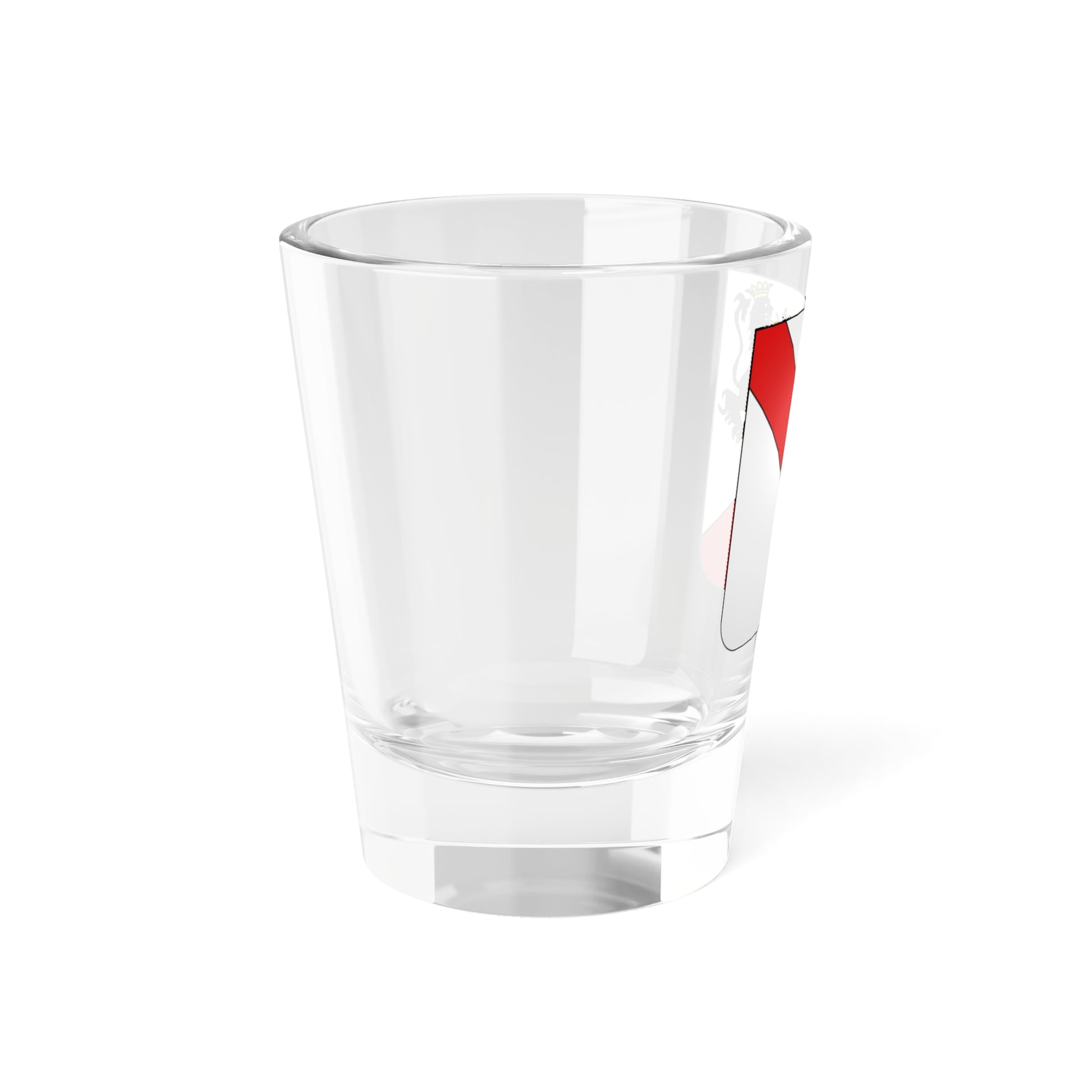This shot glass showcases the official heraldic emblem of Courcelles, a francophone municipality located in the Hainaut province of Belgium. The design is a faithful representation of the town's coat of arms, a symbol rich in history and meaning.