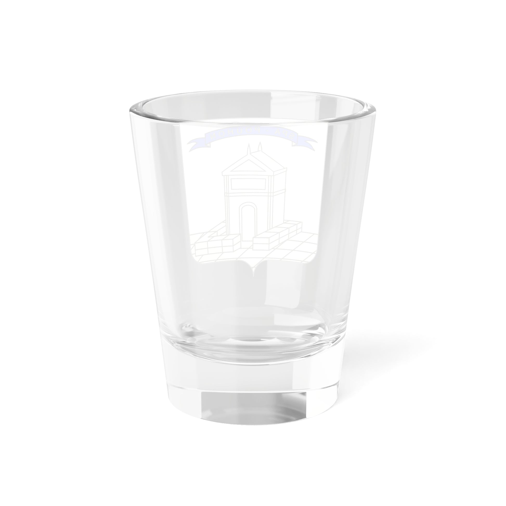 The artwork directly reflects the town's history. The pouhon represents the ancient Roman tradition of visiting Spa for its therapeutic waters. The inscription further solidifies the link between the town and its famous thermal heritage. This shot glass design is a small, but detailed, testament to Spa's rich historical and cultural identity.