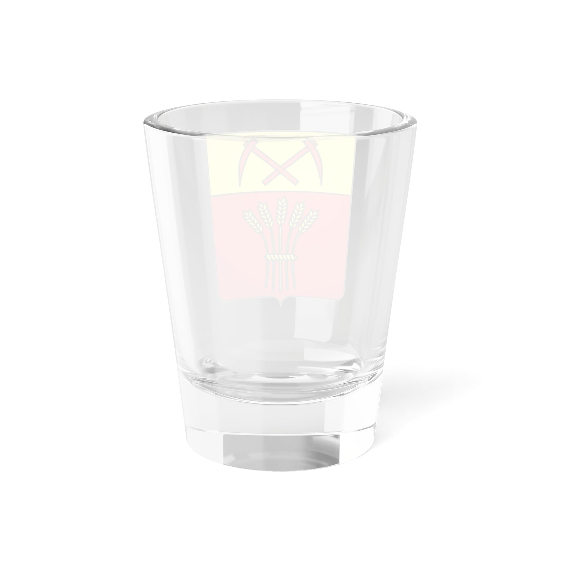 This shot glass showcases the striking coat of arms of Villers-le-Bouillet, a municipality in the province of Liège, Belgium. The design is a bold representation of the region's heritage, meticulously rendered for visual impact.