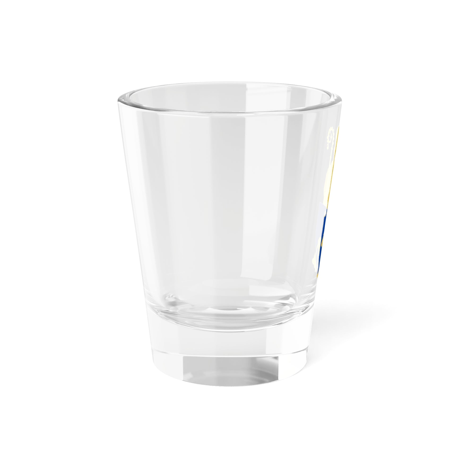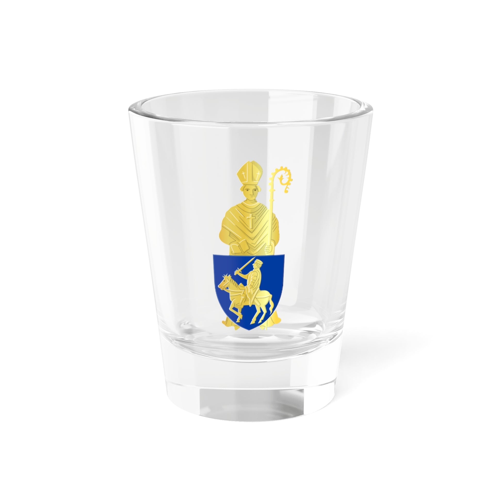 This shot glass showcases the coat of arms of Herstal, a municipality in Liège, Belgium. The design is a vibrant representation of the town's historical and religious significance.