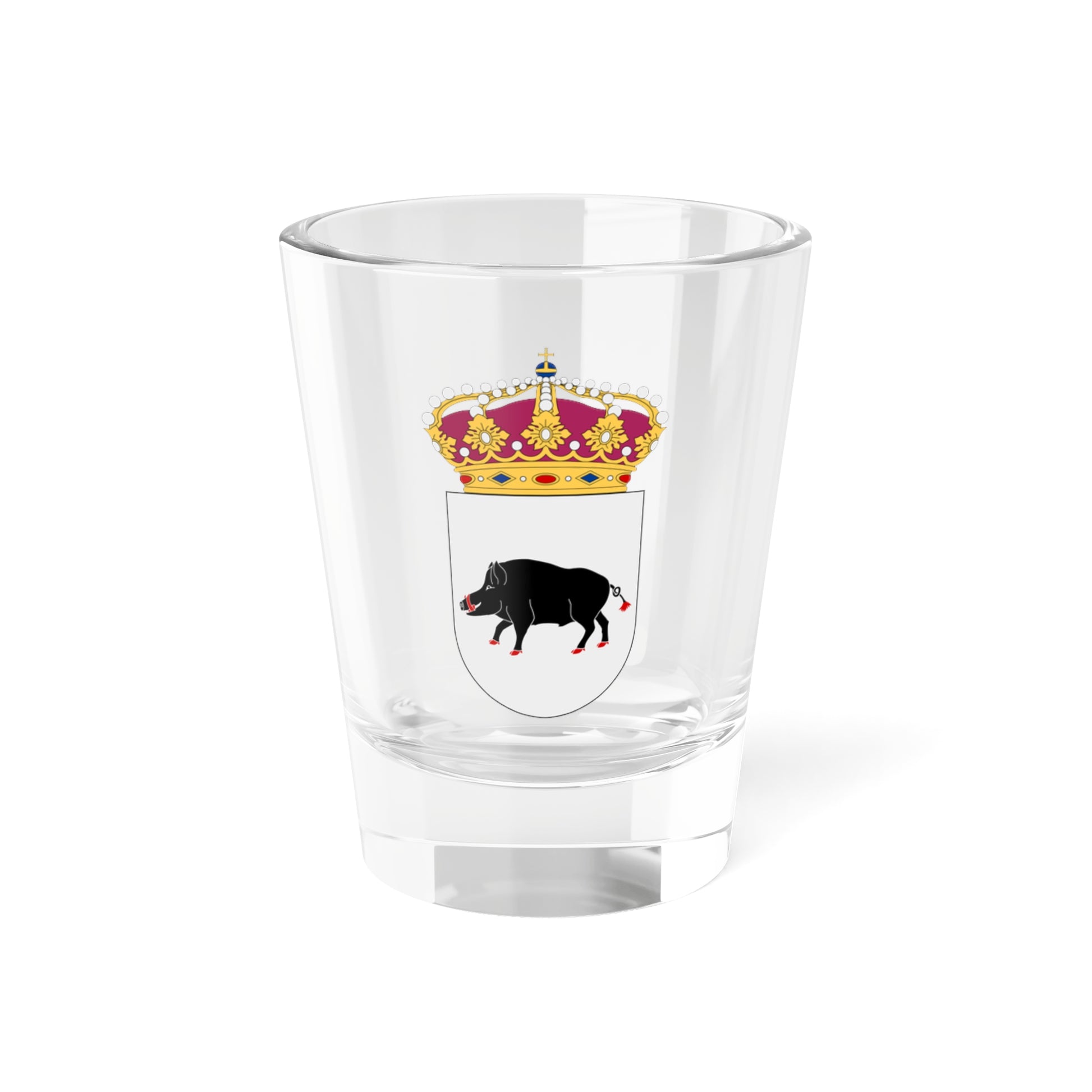 This shot glass showcases the bold heraldic emblem of the Swedish Navy ship, HMS Ornö. The design centers around a striking visual: a proud wild boar, rendered in black (sable), standing prominently against a silver (argent) background.