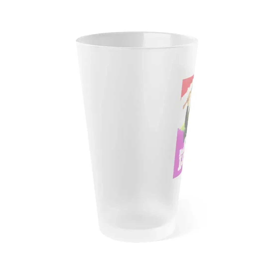 Frosted pint glass (16 oz / ≈0.47 L) with a soft matte finish and semi-translucent, one-sided print. Tough enough for bar and restaurant use, dishwasher safe, and BPA-free — a modern take on classic pintware.