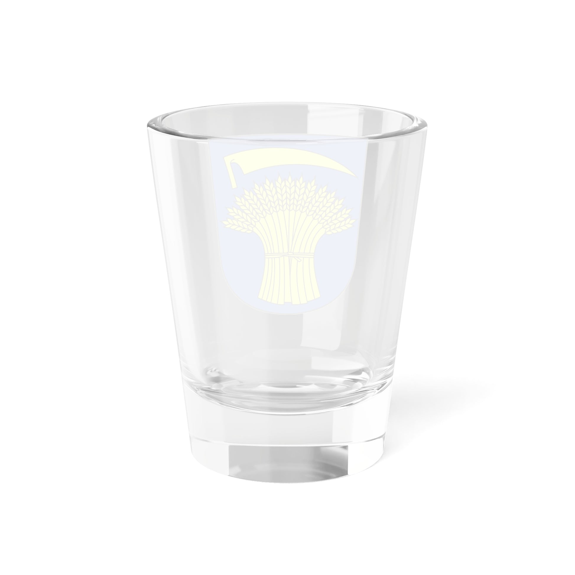 This shot glass showcases the coat of arms of Hüntwangen, a municipality in the canton of Zürich, Switzerland. The design is a bold visual representation of the region's rich agricultural history.