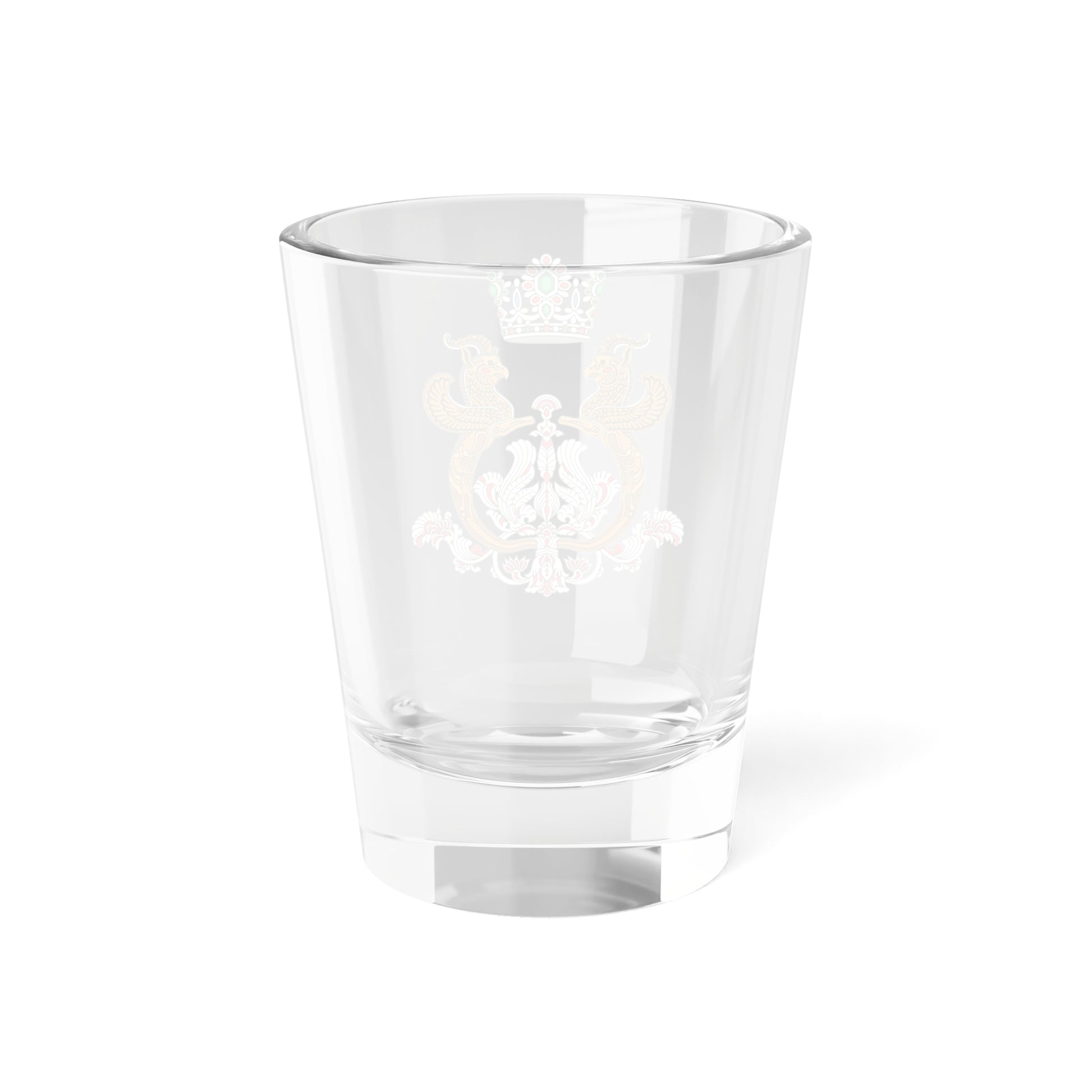 This shot glass showcases the majestic Imperial Arms of the Shahbanou of Iran, a striking emblem of imperial authority and regal elegance.