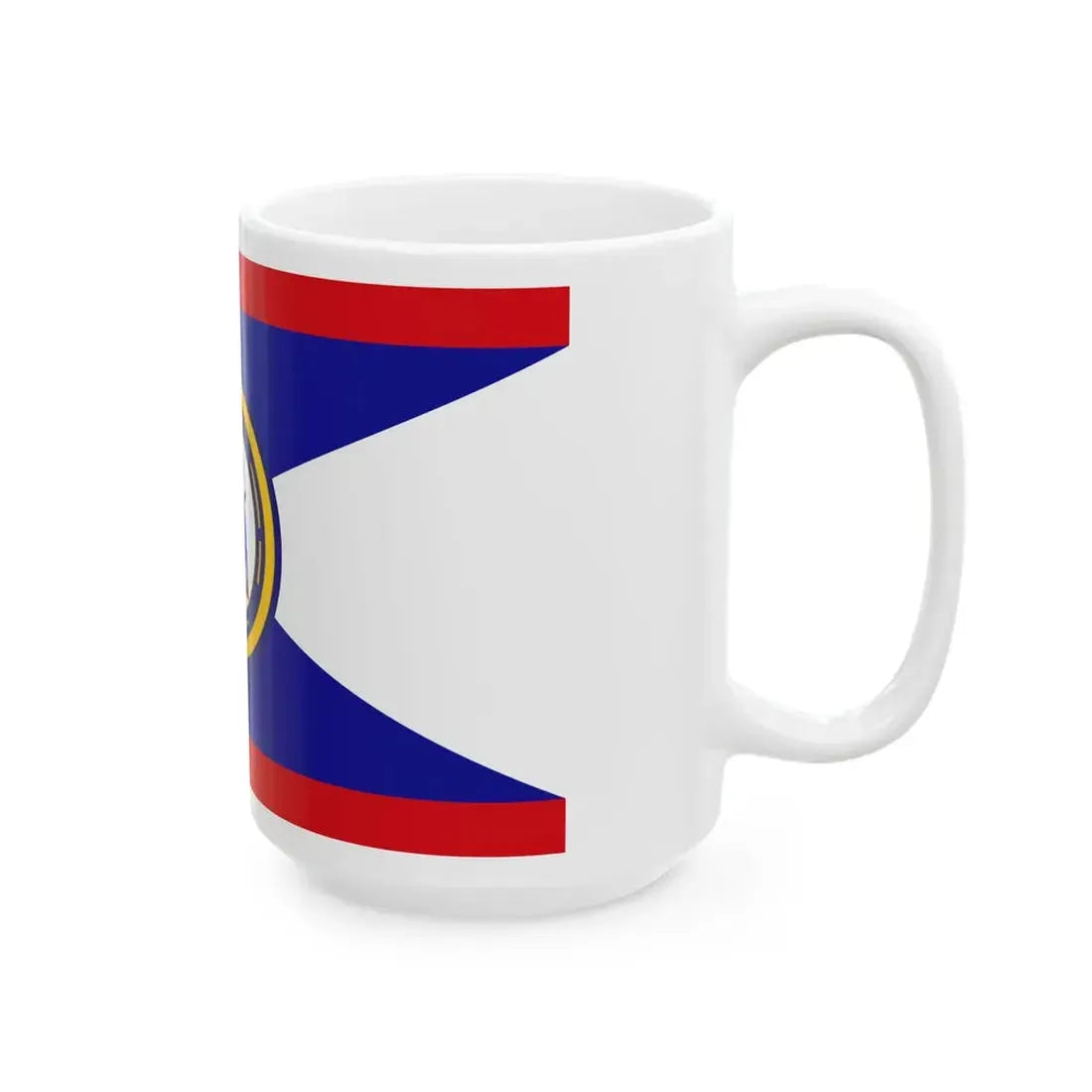 This white coffee mug showcases the design of the Infobox Flag of the Belize Coast Guard. The flag's distinctive blue field, divided by a central white stripe, houses five yellow stars in the canton representing the five districts of Belize. At the hoist end, the Coast Guard emblem, a gold anchor, adds to the design's intrigue. This mug is a thoughtful representation for those with an interest in Belizean symbols, coastal security forces, or unique drinkware.