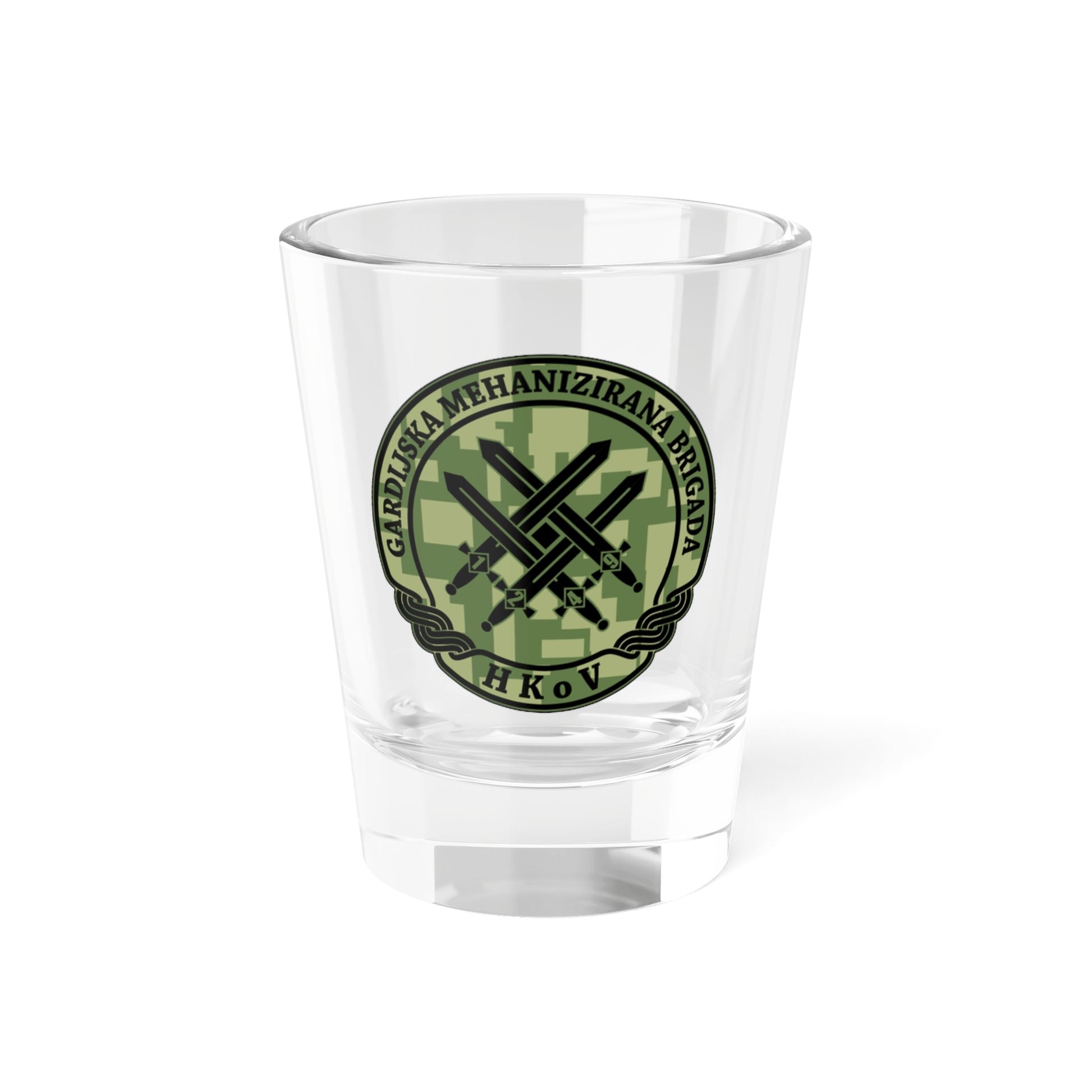 This shot glass showcases the distinctive insignia of the Guards Mechanized Brigade (GMBR) of the Croatian Army, a symbol steeped in military tradition and national pride. The design powerfully communicates the brigade's identity and its connection to the Croatian state.