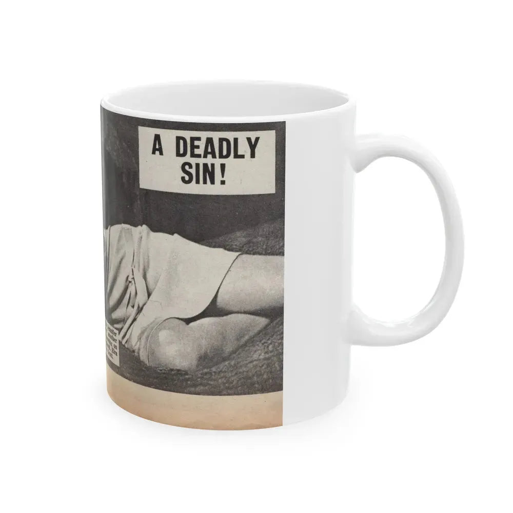 Jennifer Jayne #15 - 7x4 B&W Sexy Photo on Bed from U.K. News Paper Clipping (Vintage Female Icon) White Coffee Mug