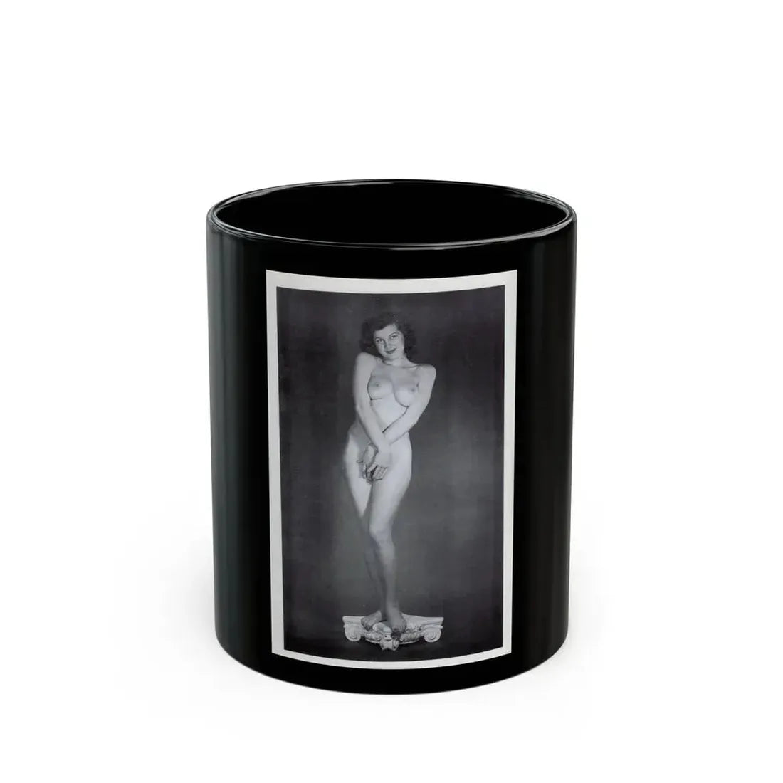 The Joanne Arnold #41 - Topless (Vintage Female Icon) Black Coffee Mug offers a conversational piece for any kitchen or coffee table. This mug's design serves not only as a functional drinkware item but also as a fascinating artifact that tells a story of the past. The black color adds a modern twist to the retro feel, making it versatile and suitable for various decors. Whether you are a collector of vintage memorabilia or simply someone who enjoys a touch of nostalgia in their daily life, this mug is an excellent addition to your collection.
