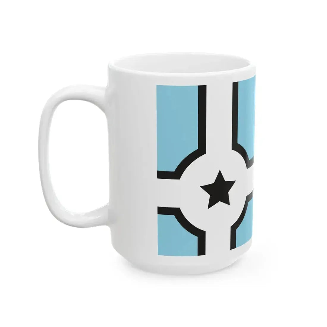 This unique white coffee mug showcases a thoughtful design inspired by the Joplin Missouri Crossroads flag proposal. The proposal, which was submitted but not adopted, featured a distinctive star symbolizing the city's location at the intersection of various routes in the heartland. This design embodies a sense of history and local pride for those who appreciate Joplin's unique identity.