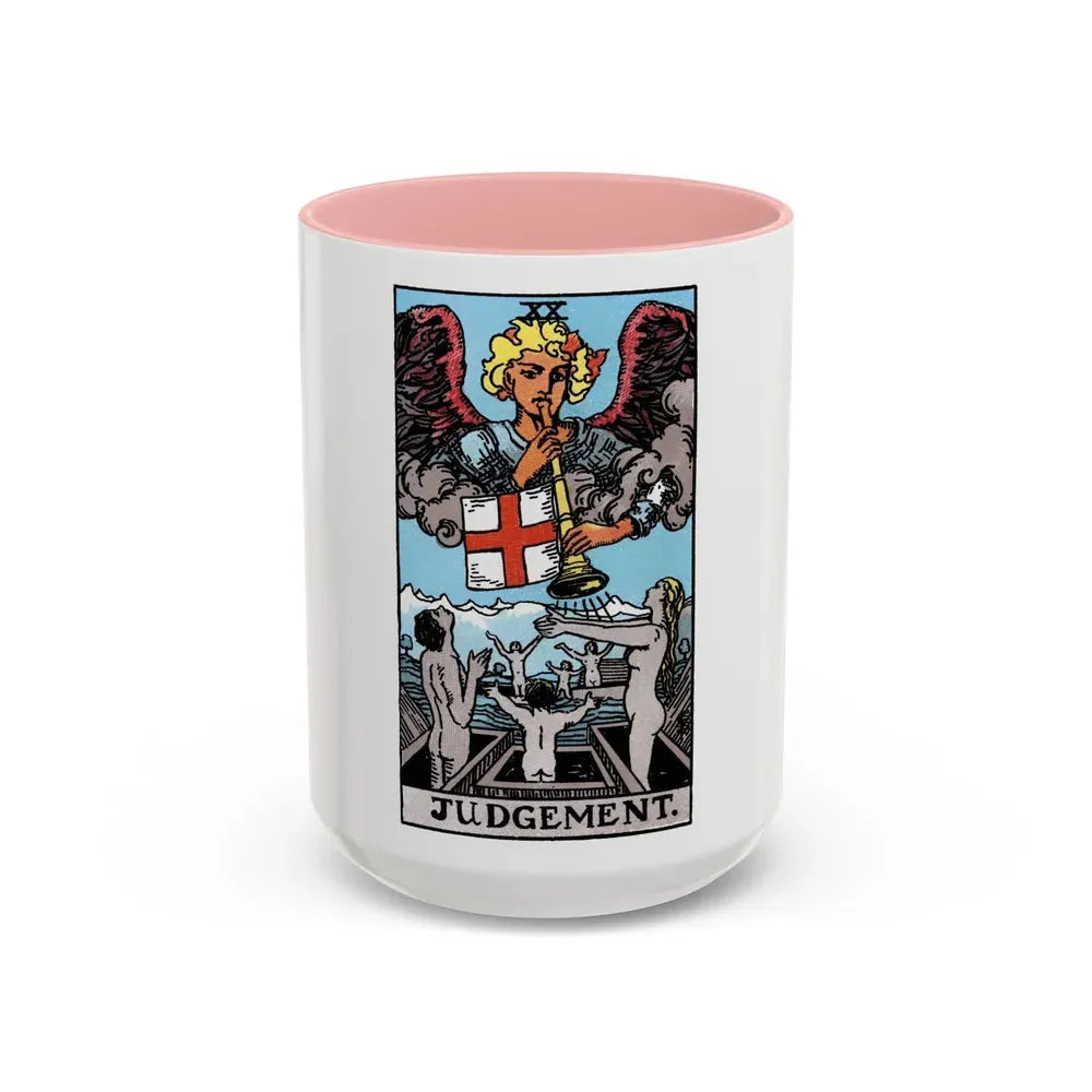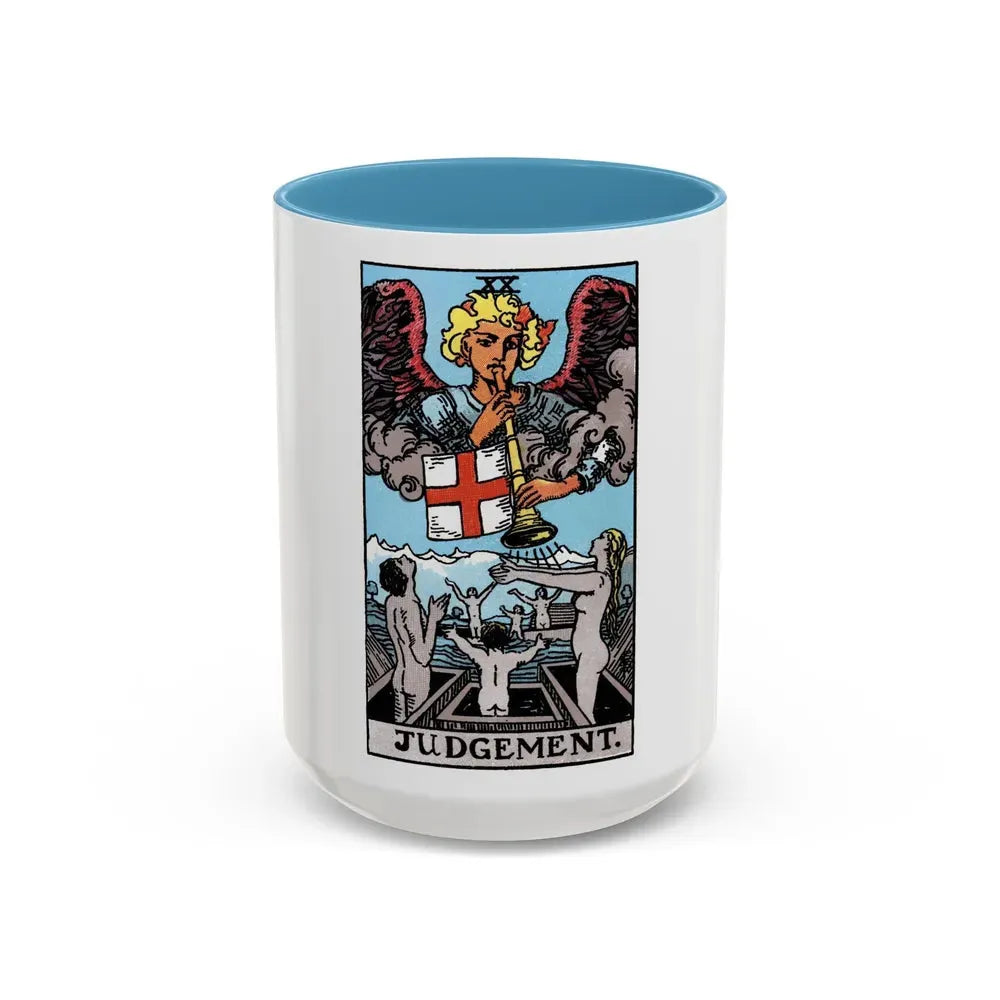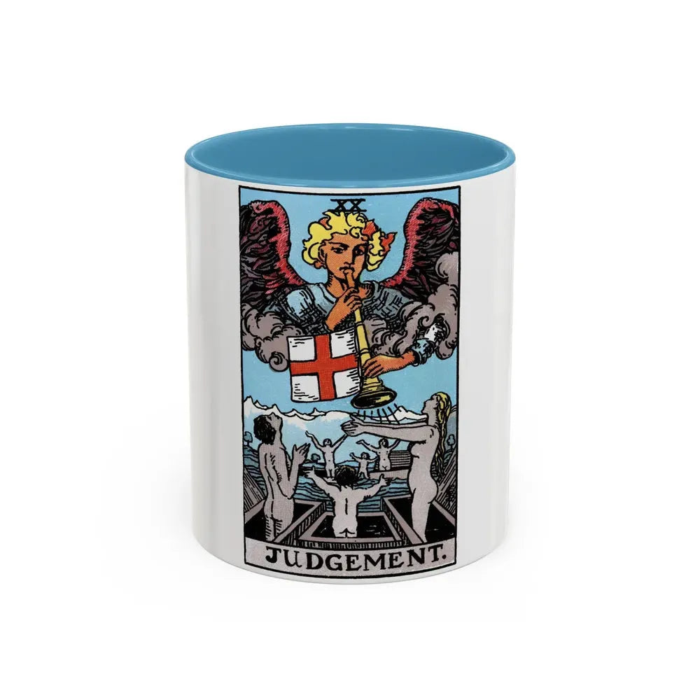 Delve into the mystical realm of Tarot with this Judgement Coffee Mug. Inspired by the tarot card symbolizing self-realization and the power to overcome obstacles, this mug makes a captivating addition to any collection. The design features intricate artwork that brings to life the iconic image from the Major Arcana - a central figure resplendent in white robes, blowing a trumpet, surrounded by flames and roses. It serves as an inspiring reminder to face challenges head-on and trust in your inner wisdom. Perfect for anyone who appreciates unique and cool drinkware, especially those with an interest in Tarot or mythical symbolism.