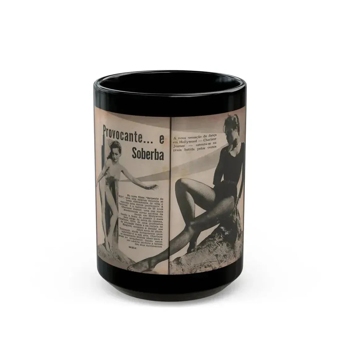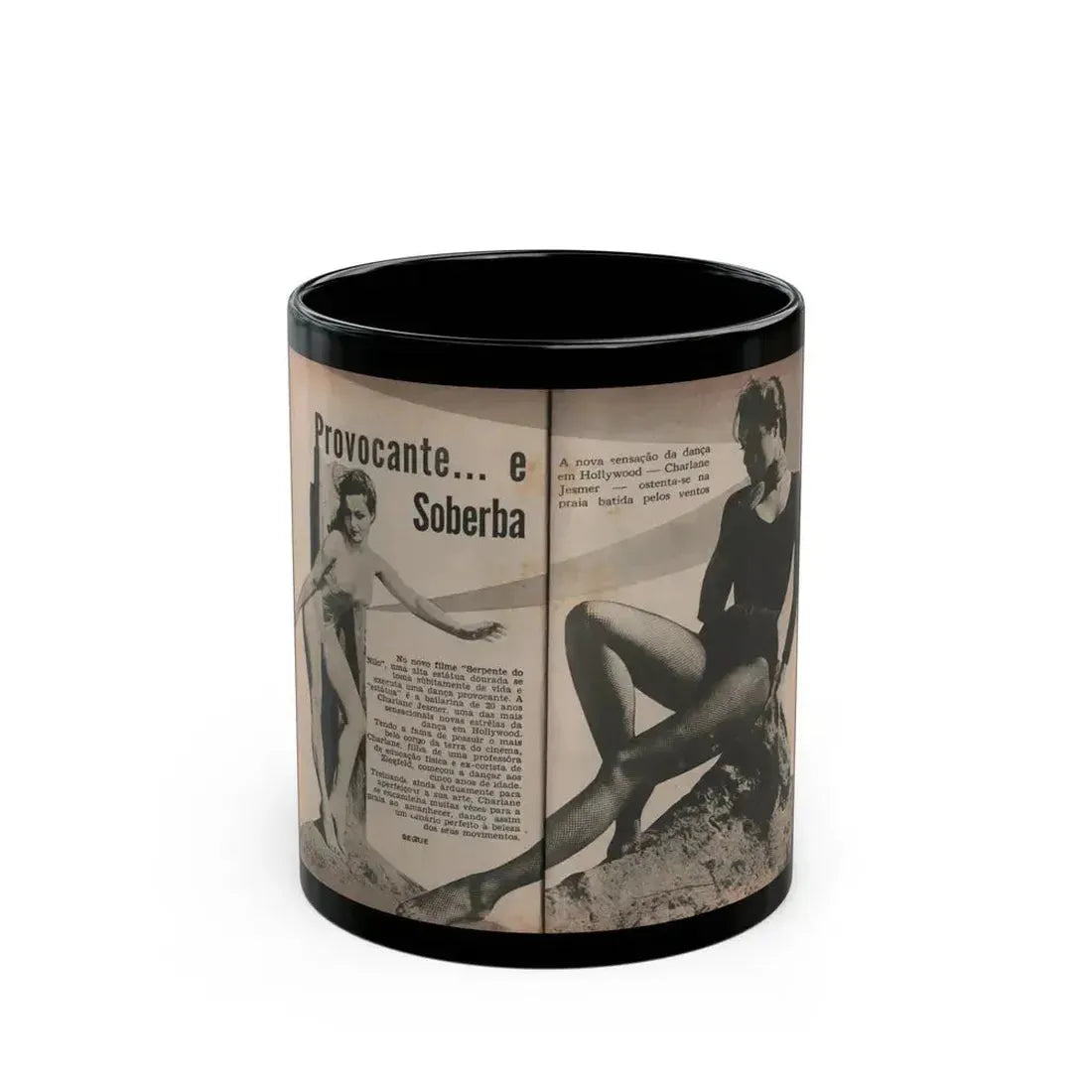 This unique black coffee mug features iconic images of Julie Newmar from the 1955 edition of Aconteceu MARCO DE, a Brazilian digest magazine. The design showcases pages 1 & 2 from the publication, along with two black and white photos of Newmar and an accompanying article and caption. As a versatile actress who gained fame for her role as Catwoman in the 1960s Batman television series, this mug is perfect for anyone who appreciates vintage pop culture or female icons.