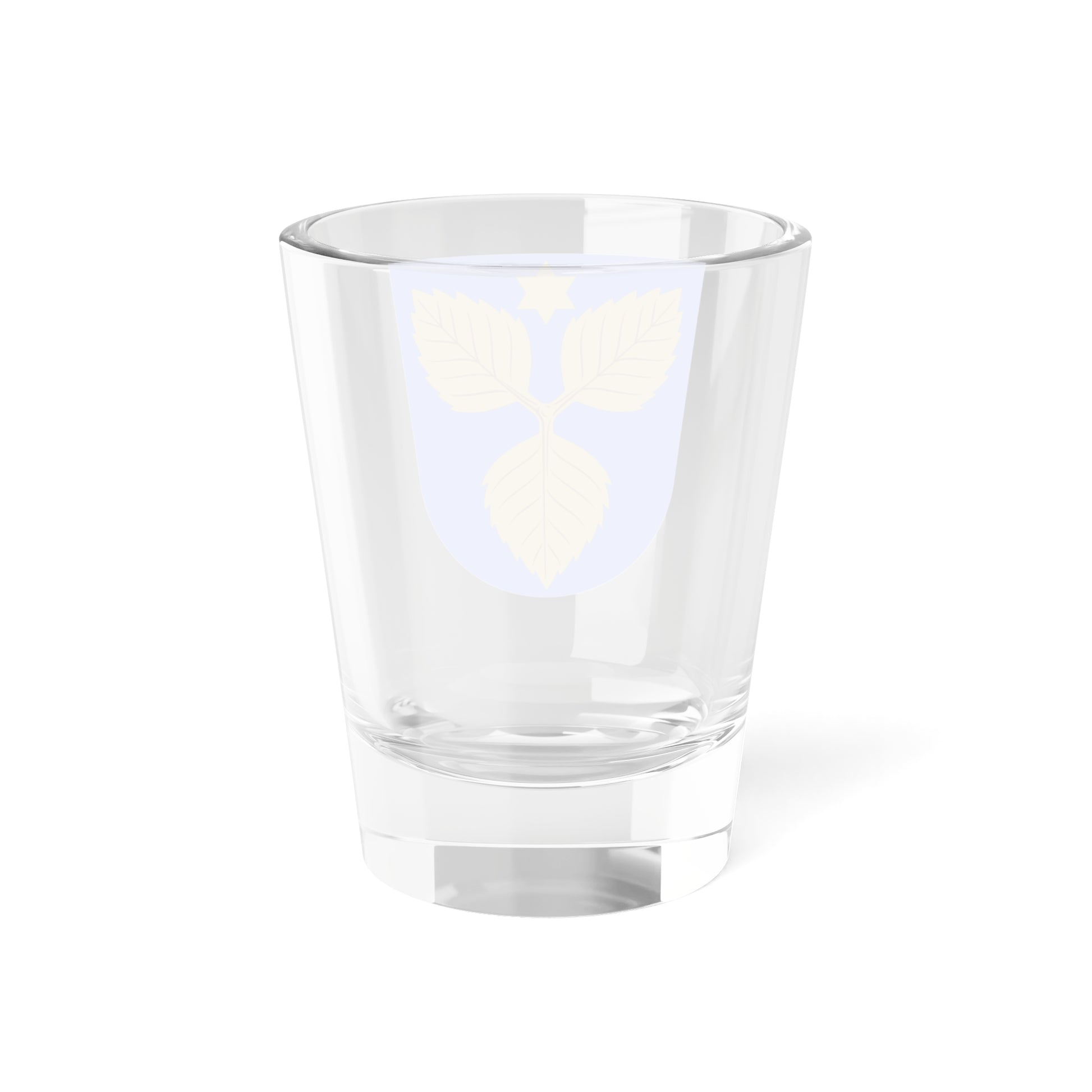 This shot glass features the eye-catching coat of arms of Karjalohja, a former Finnish municipality. It's like a tiny golden trophy resting on a blue background, with a stylized birch twig that looks like a magical trident. The six-pointed star above it adds a touch of celestial magic. This design celebrates the rich history and natural beauty of the region.