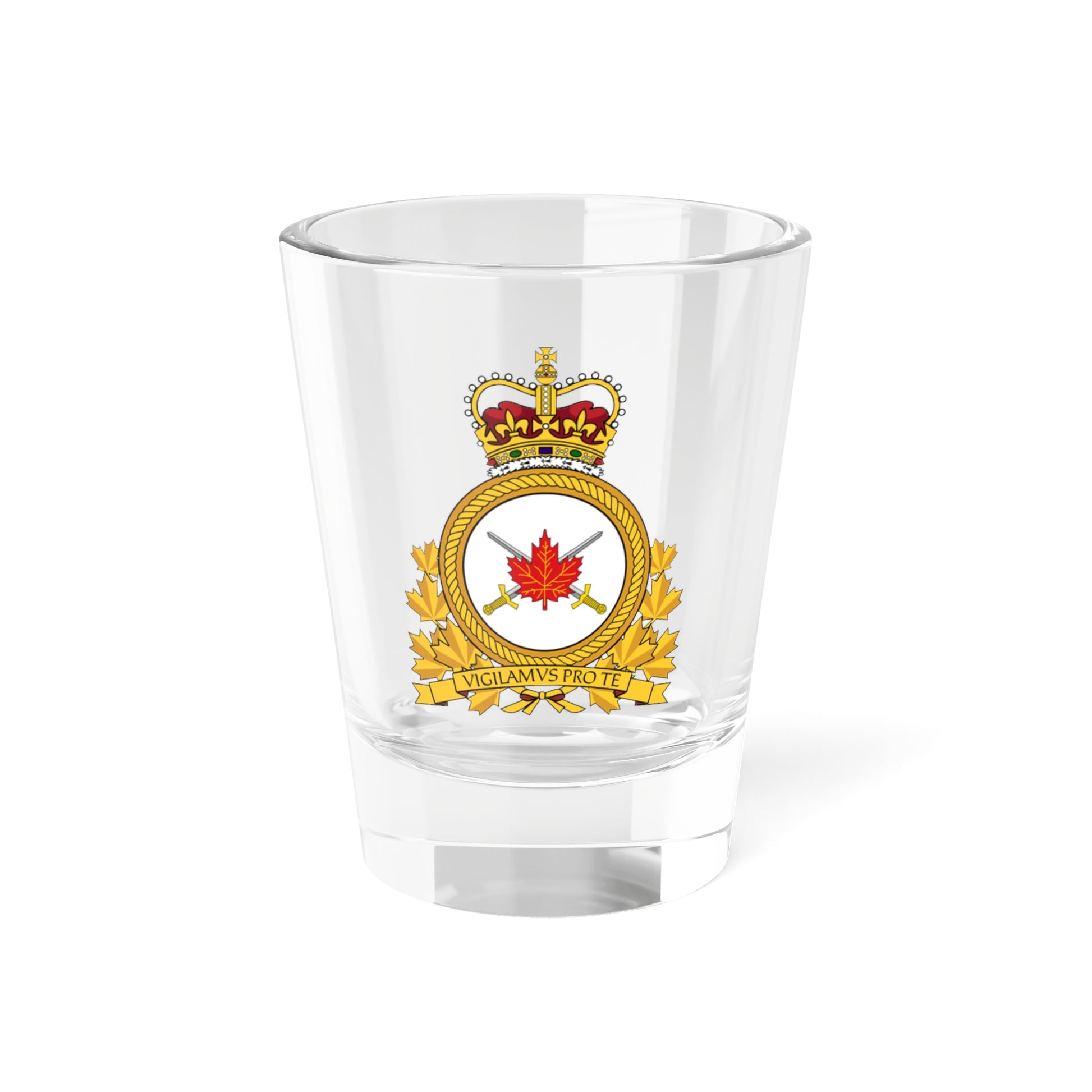 Hey there! This shot glass is designed with the LANDFORCOM Emblem (Canada), a fancy badge the Canadian Army used to rock back in the day. πŸ‡¨πŸ‡¦ The emblem features two silver swords crossed with golden hilts and pommels, topped off with a fiery red maple leaf. πŸβš”οΈ It's like a superhero symbol for land-warfare heroes! πŸ¦Έβ€β™€οΈ This shot glass is perfect for any Land Force Command enthusiast, or anyone who loves a touch of Canadian history on their barware. 🍁🍸