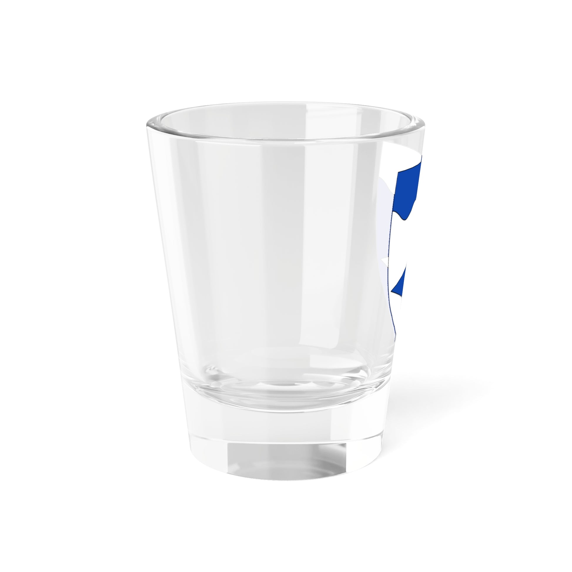 This shot glass showcases the heraldic artistry of the Lasnamäe district in Tallinn, Estonia, a modern emblem rich in symbolic meaning. The design is a study in contrasting colors and shapes, instantly catching the eye.