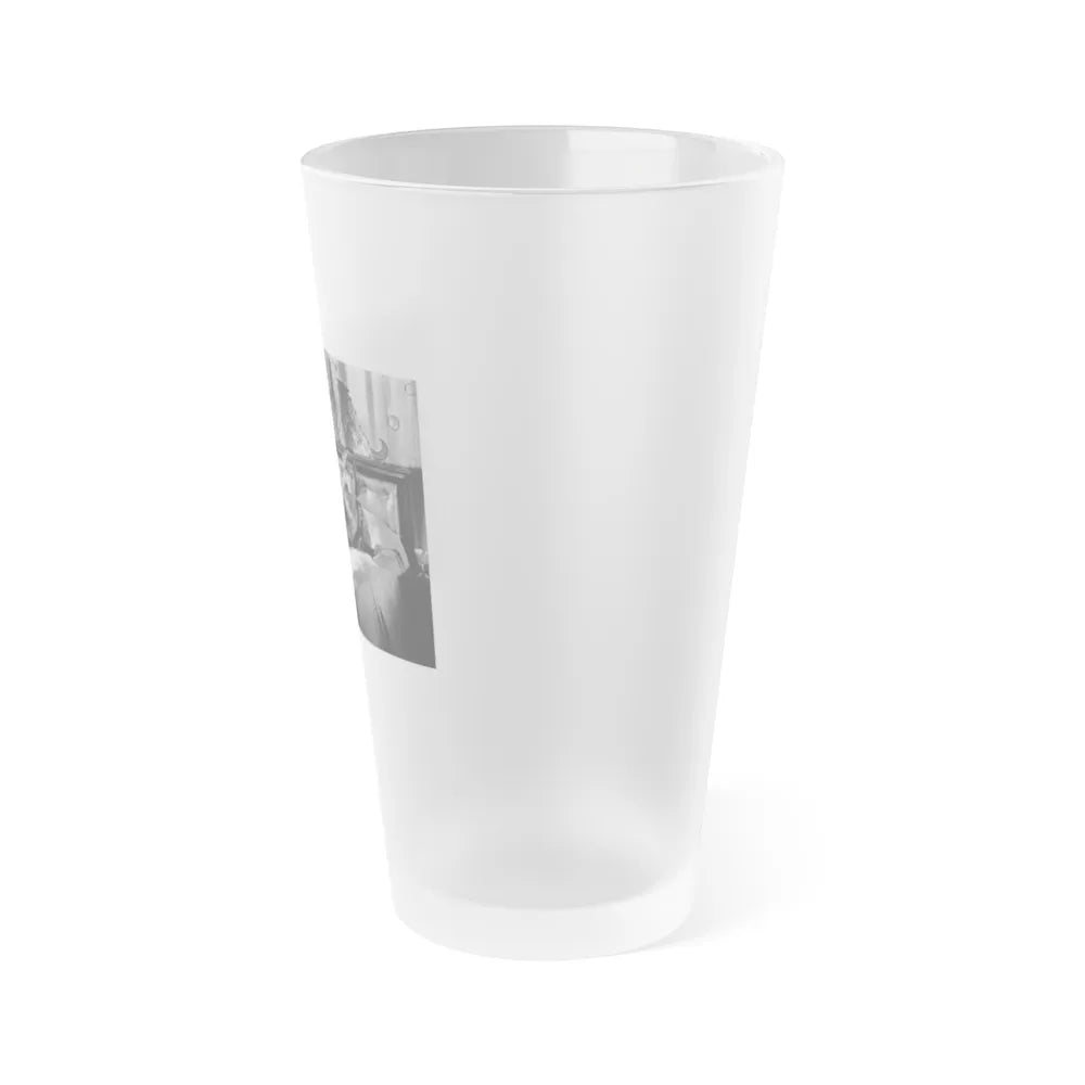 Frosted pint glass (16 oz / ≈0.47 L) with a soft matte finish and semi-translucent, one-sided print. Tough enough for bar and restaurant use, dishwasher safe, and BPA-free — a modern take on classic pintware.