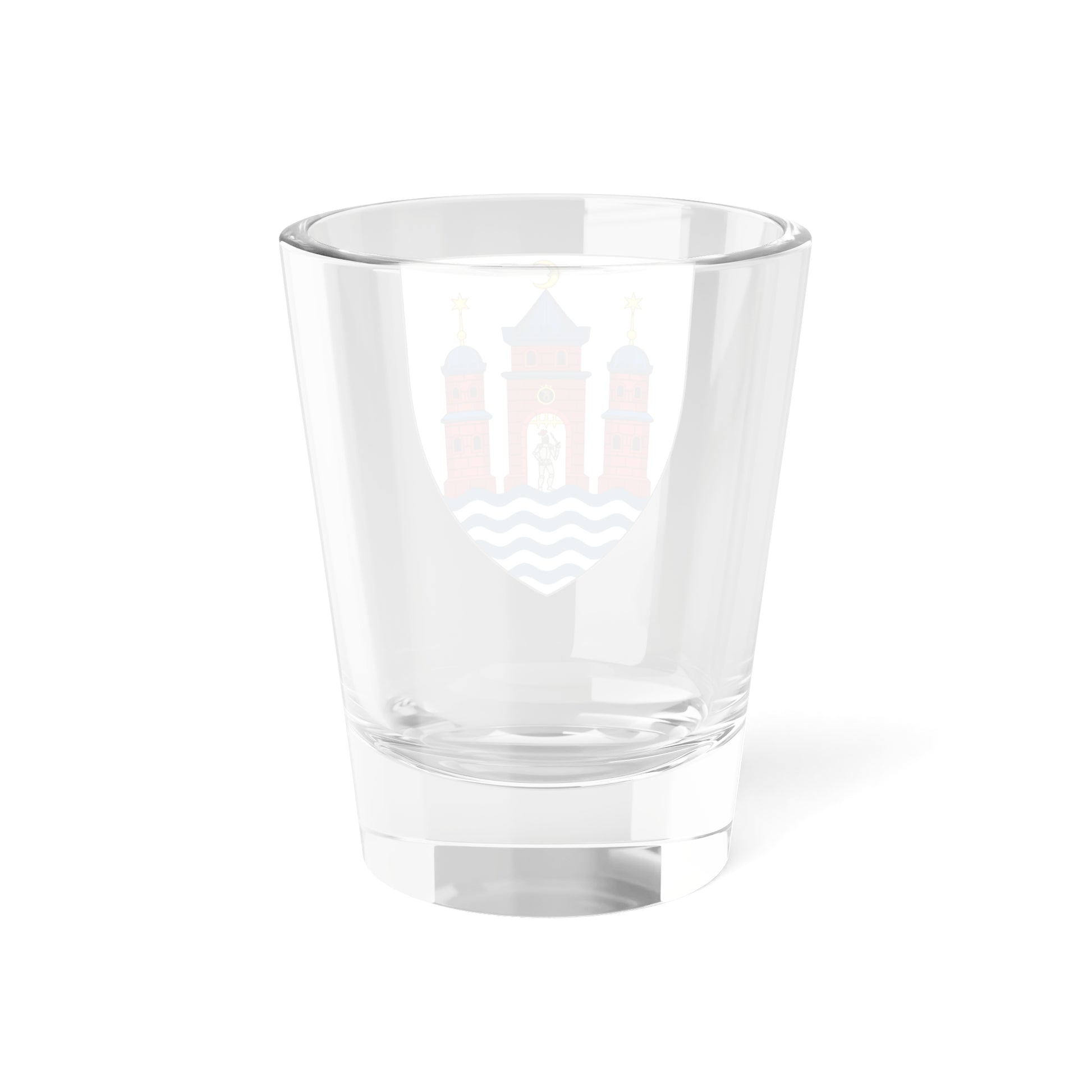This shot glass showcases the Lesser Coat of Arms of Copenhagen, a distilled and powerful emblem of the Danish capital. The design centers on the shield, its crimson (gules) background providing a striking foundation.