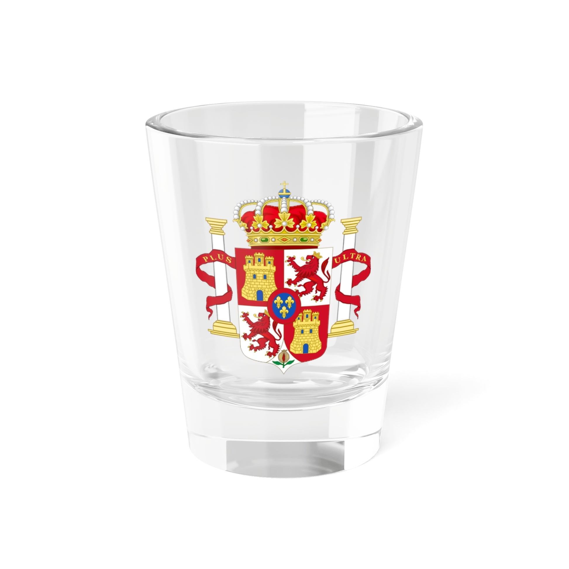 This shot glass showcases a historic symbol of Spanish royalty: the Lesser Royal Coat of Arms, specifically the Pillars of Hercules variant, used between 1700-1868 and 1834-1930. The design is a condensed version of the full royal arms, emphasizing key heraldic elements.