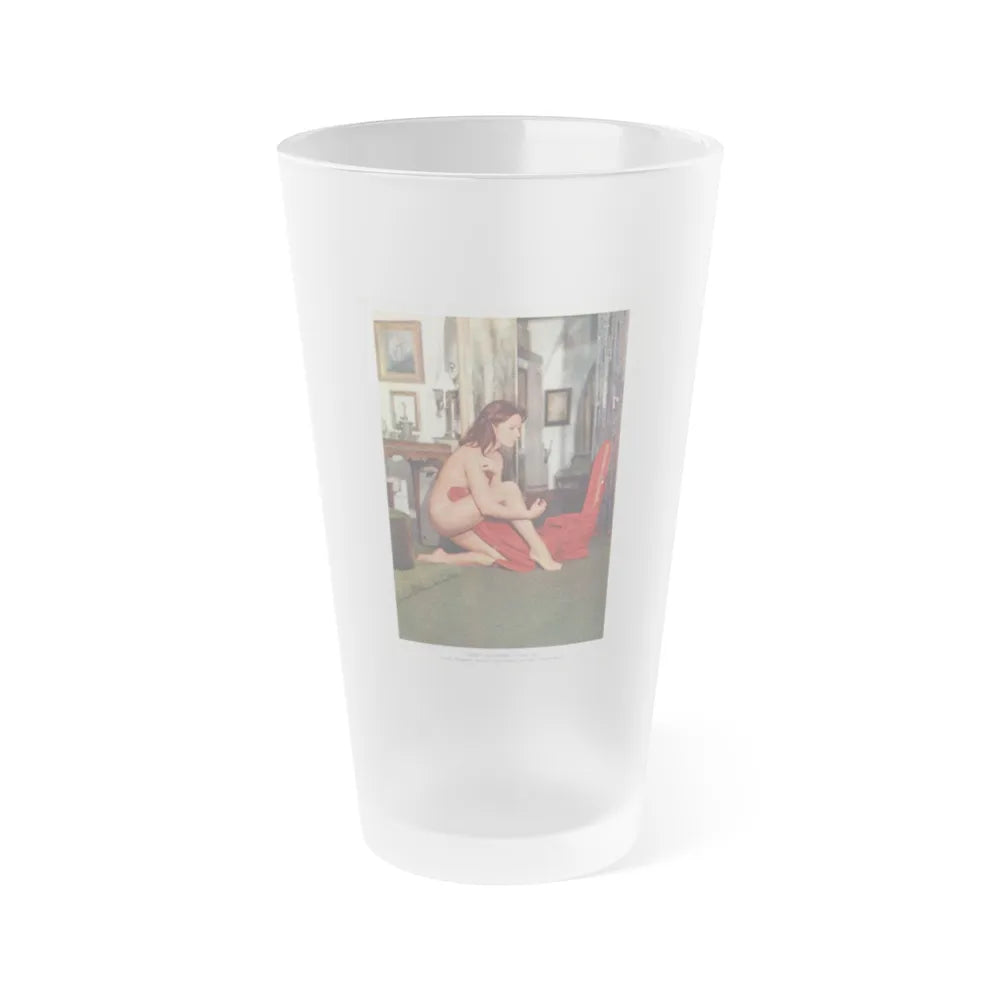 Frosted pint glass (16 oz / ≈0.47 L) with a soft matte finish and semi-translucent, one-sided print. Tough enough for bar and restaurant use, dishwasher safe, and BPA-free — a modern take on classic pintware.