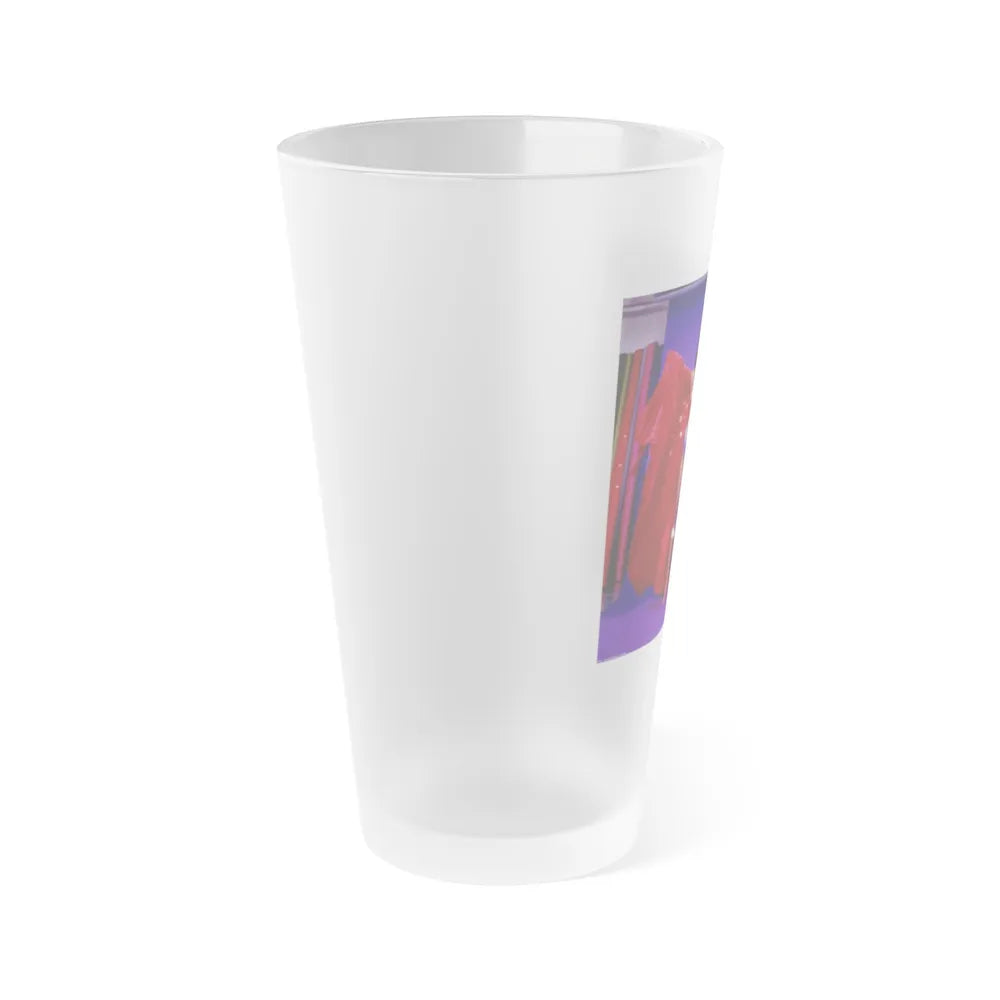 Frosted pint glass (16 oz / ≈0.47 L) with a soft matte finish and semi-translucent, one-sided print. Tough enough for bar and restaurant use, dishwasher safe, and BPA-free — a modern take on classic pintware.