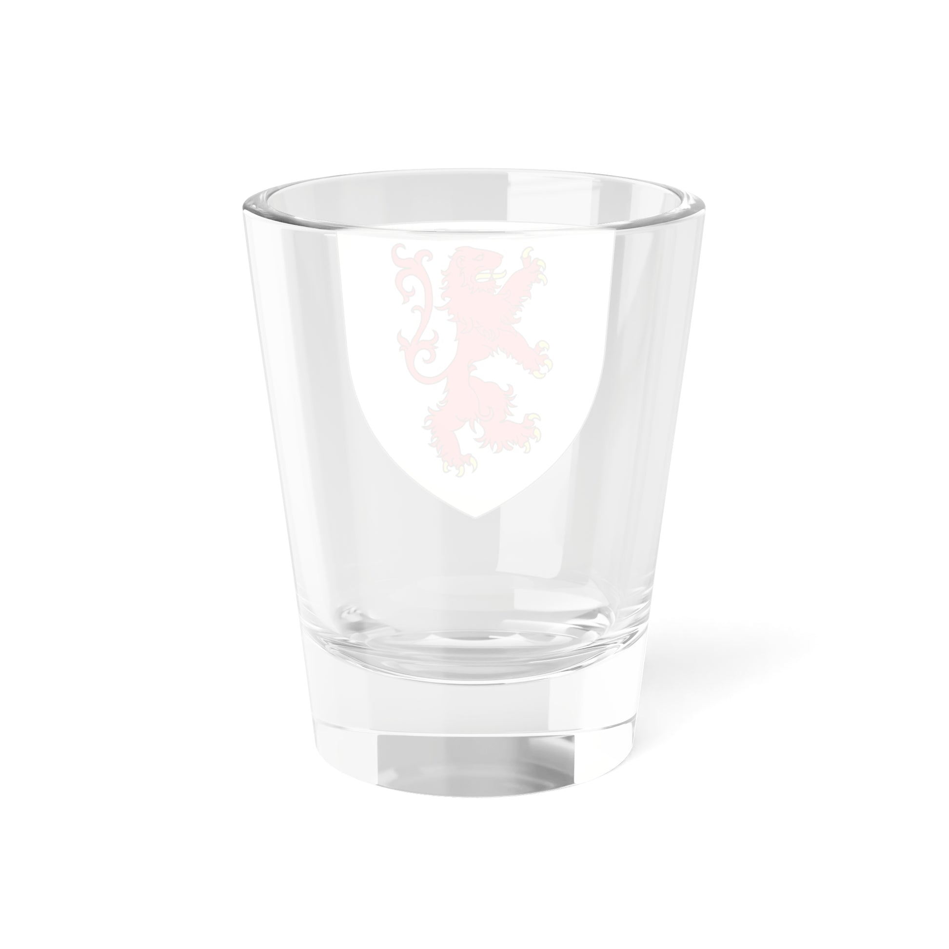 This shot glass showcases the historic McQuillan Coat of Arms, a powerful emblem steeped in Irish heritage and nobility. The design centers around the shield, displaying a fiercely rendered red lion rampant against a gold field. This iconic imagery of the lion, a symbol of bravery and valor, stands in stark contrast to the gold background, immediately capturing attention.