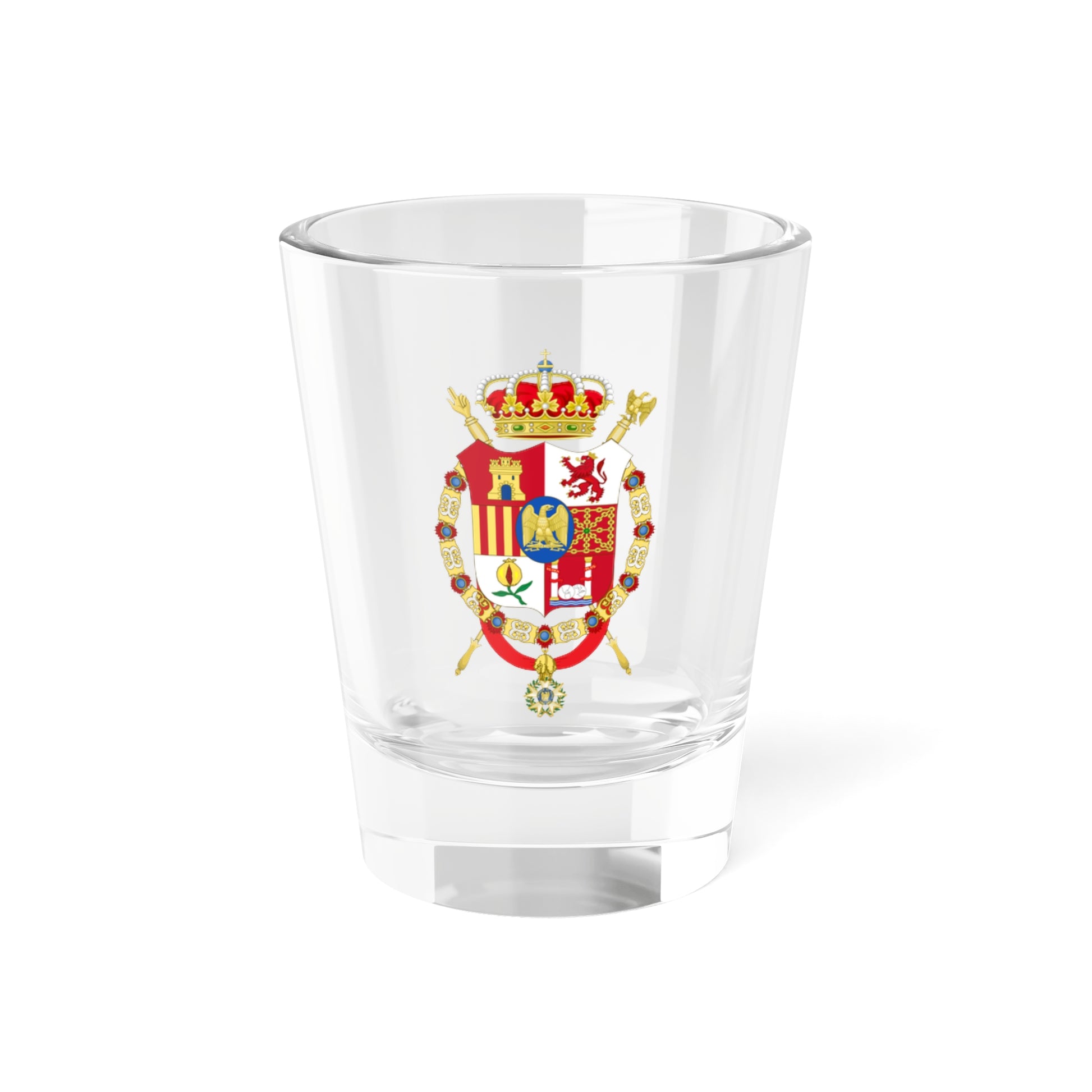 This shot glass showcases the intricate Middle Coat of Arms of Joseph Bonaparte, designed during his reign as King of Spain (1808-1813). The artwork presents a balanced blend of heraldic formality and practicality, reflecting its role in official documentation and ceremonial display.