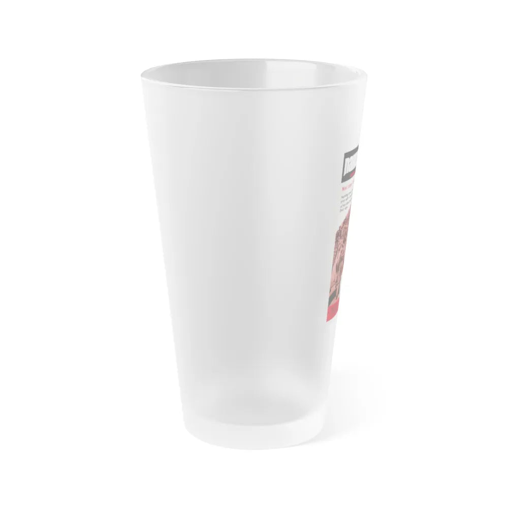 Frosted pint glass (16 oz / ≈0.47 L) with a soft matte finish and semi-translucent, one-sided print. Tough enough for bar and restaurant use, dishwasher safe, and BPA-free — a modern take on classic pintware.
