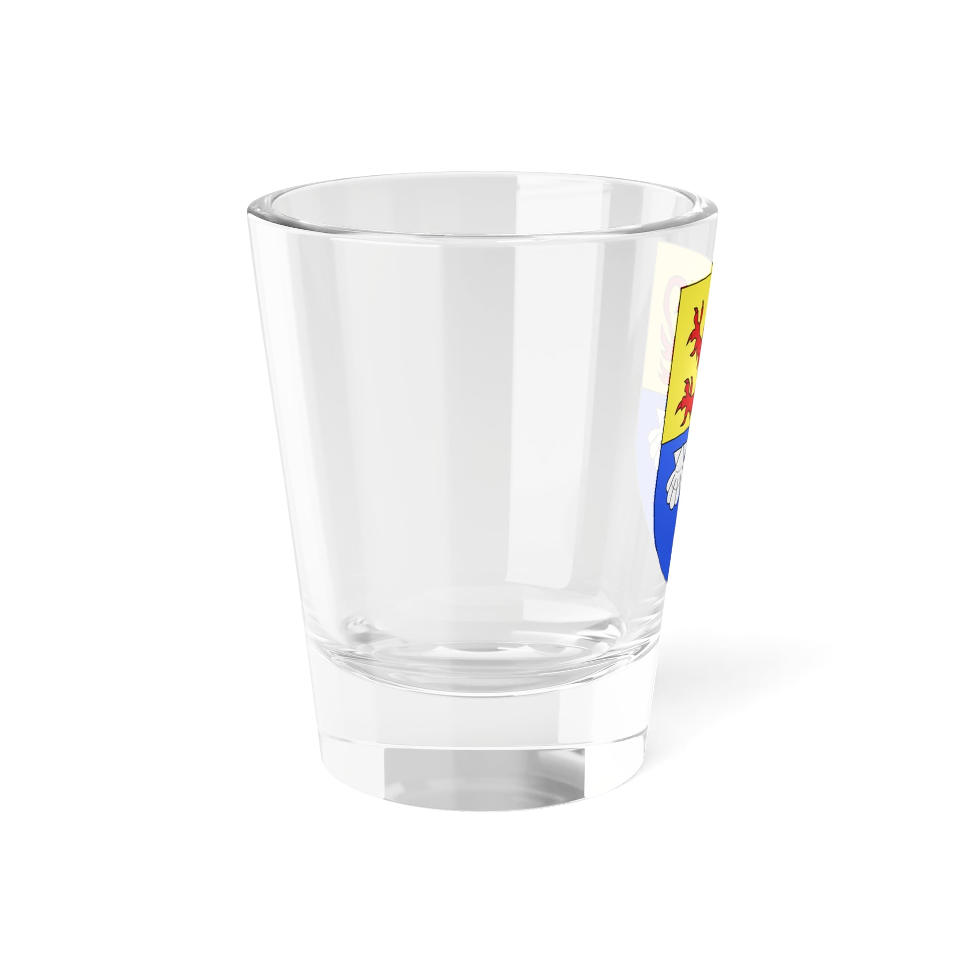 This shot glass showcases the distinguished coat of arms of Noréaz, a former municipality in Fribourg, Switzerland, a striking emblem steeped in history and symbolic meaning.