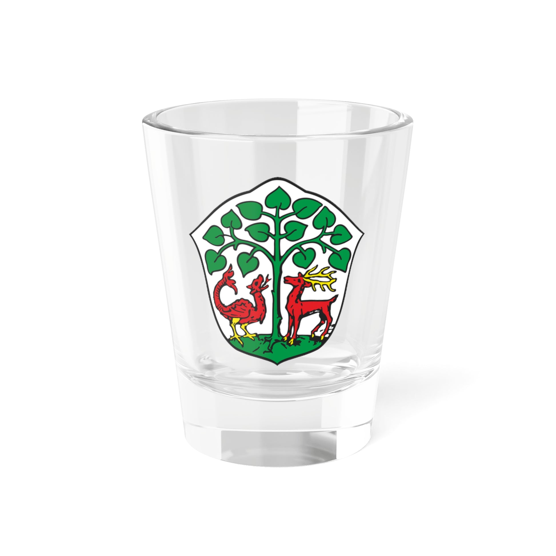 This shot glass showcases the historic coat of arms of Braniewo, a Polish town steeped in heritage.