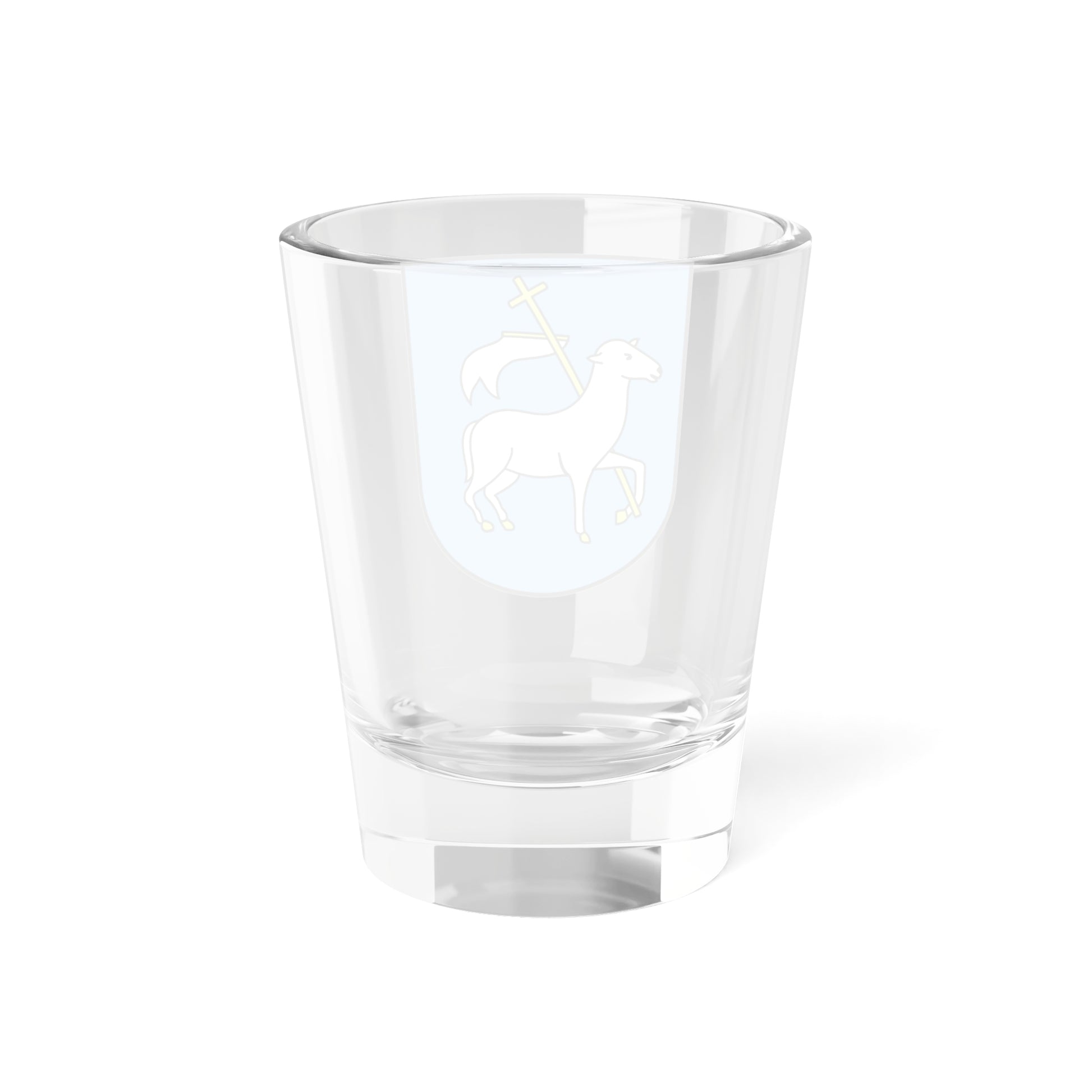 This shot glass showcases the heraldic emblem, or Coat of Arms, of Brzozowice, a district within Piekary Śląskie, Poland. The design centers around a striking visual: the Lamb of God (Agnus Dei), the central element.