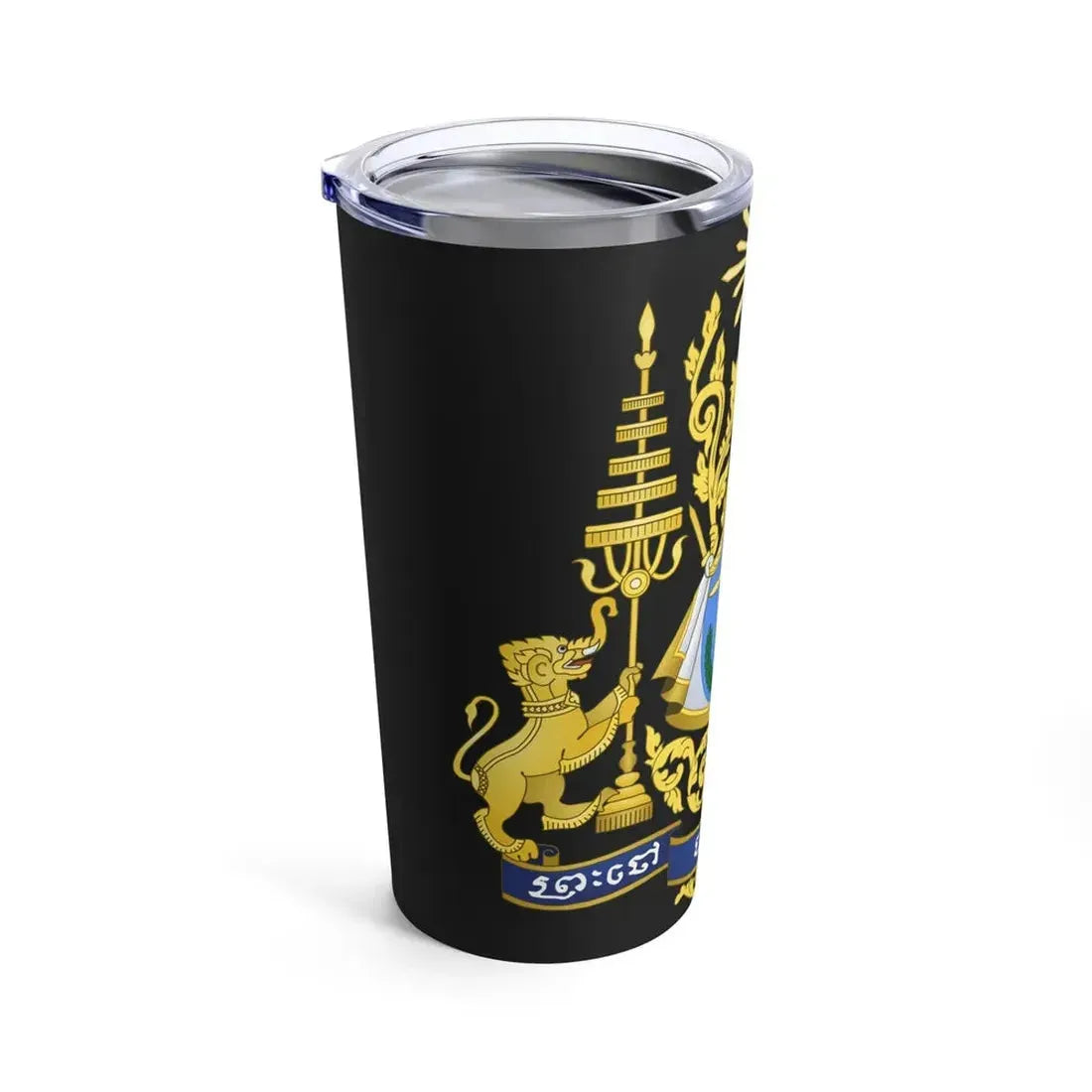 The Royal Arms of Cambodia is the national coat of arms used by the Khmer kingdom since its reinstatement on May 24, 1993, during the reign of King Norodom Sihanouk. It consists of a shield divided into five compartments, symbolizing unity and peace. The central compartment features the image of Angkor Wat, a symbol of Cambodia's cultural heritage and religious significance. The remaining four compartments represent the four historical regions of Cambodia: Angkor, Kampuchea Krom (Mekong Delta), Battambang, and Mondolkiri. At the top of the shield is a white elephant, symbolizing royal power and wisdom, grasping the Naga serpent, representing water and fertility. The crest above the shield depicts Garuda, the mythical bird-man, carrying the five-towered royal palace in his claws, symbolizing the king's sovereignty. The motto "Nation, Religion, King" is inscribed below the shield. This phrase emphasizes the importance of the nation, religion, and monarchy in Cambodian society. The Royal Arms of Cambodia serves as a national emblem, symbolizing the country's rich history, cultural identity, and unity.