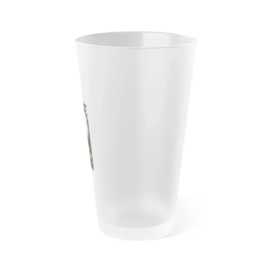 Frosted pint glass (16 oz / ≈0.47 L) with a soft matte finish and semi-translucent, one-sided print. Tough enough for bar and restaurant use, dishwasher safe, and BPA-free — a modern take on classic pintware.
