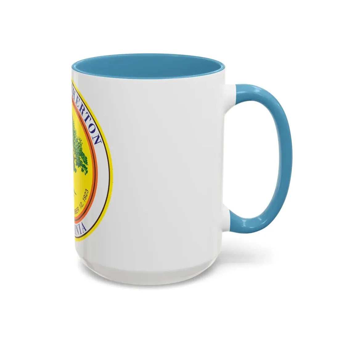 Accent ceramic mugs with a glossy white exterior and a colored interior & handle. Offered in 11 oz (≈330 ml) and 15 oz (≈440 ml), these mugs pair strong visual contrast with everyday durability — lead- and BPA-free.
