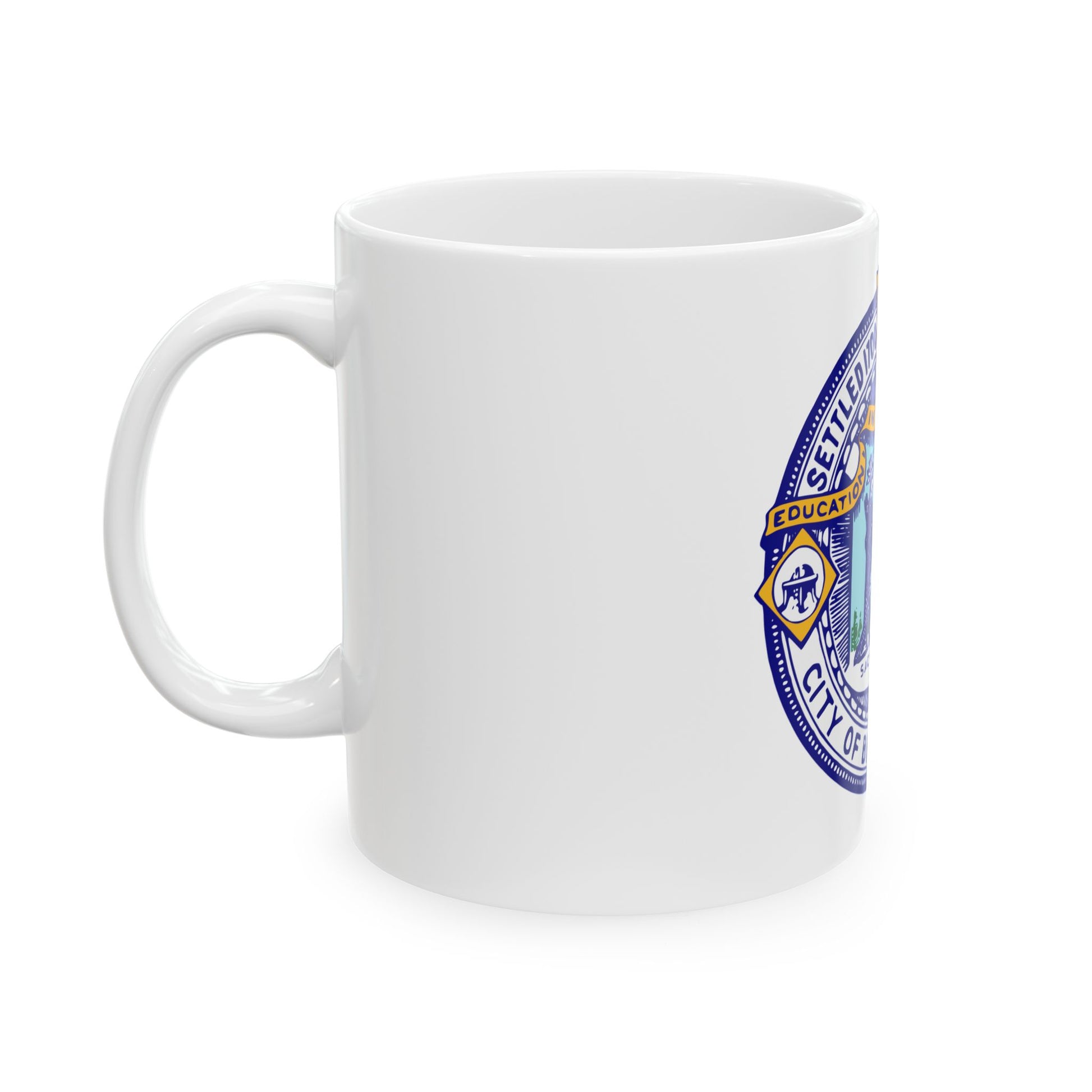 Sturdy white ceramic mugs available in 11 oz (β‰ˆ330 ml) and 15 oz (β‰ˆ440 ml), with a glossy finish and comfortable C-handle β€” microwave and dishwasher safe, and made from lead- and BPA-free materials.