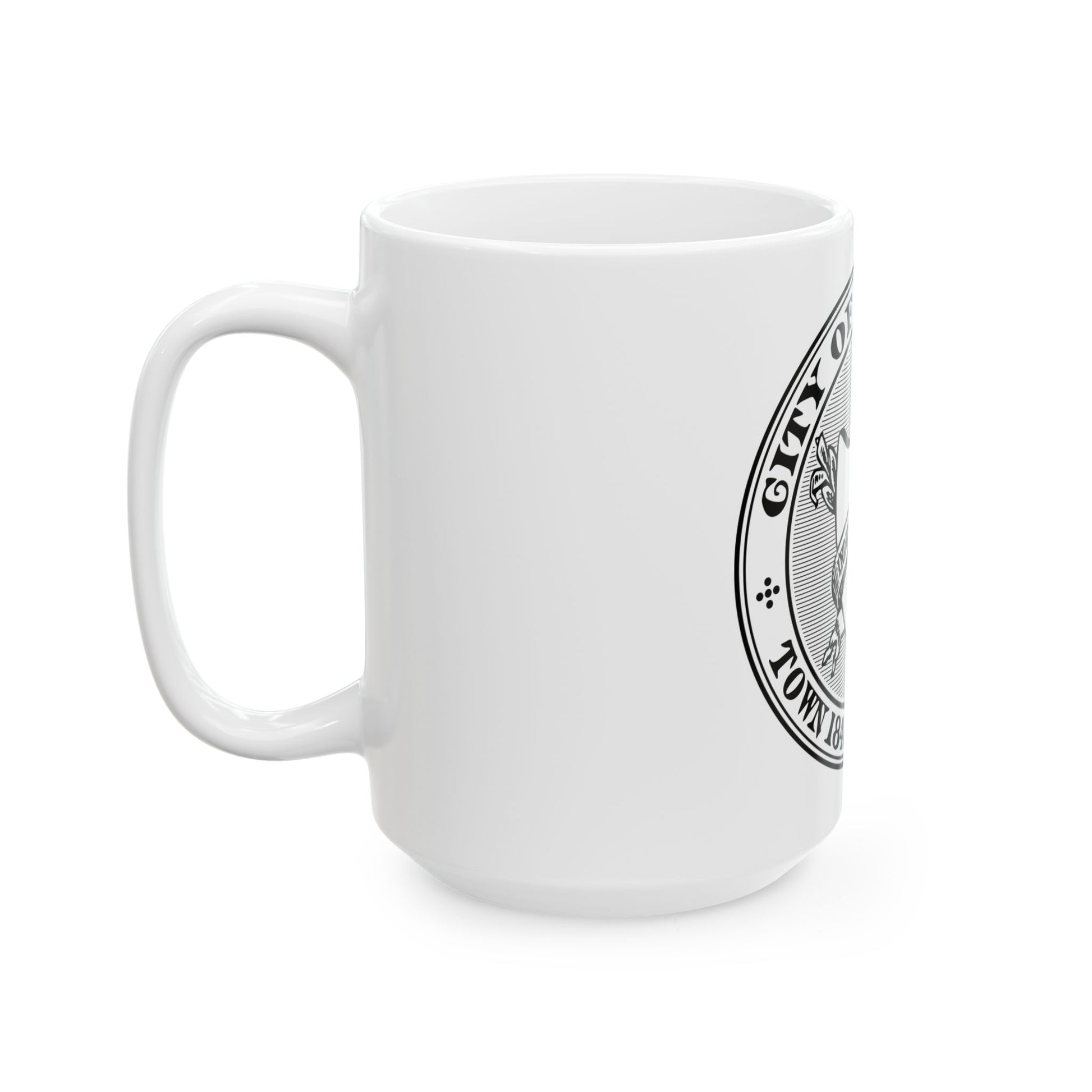 Sturdy white ceramic mugs available in 11 oz (β‰ˆ330 ml) and 15 oz (β‰ˆ440 ml), with a glossy finish and comfortable C-handle β€” microwave and dishwasher safe, and made from lead- and BPA-free materials.