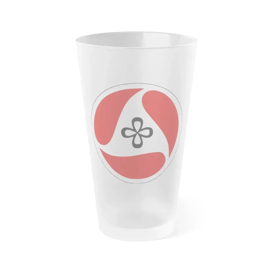 Frosted pint glass (16 oz / ≈0.47 L) with a soft matte finish and semi-translucent, one-sided print. Tough enough for bar and restaurant use, dishwasher safe, and BPA-free — a modern take on classic pintware.