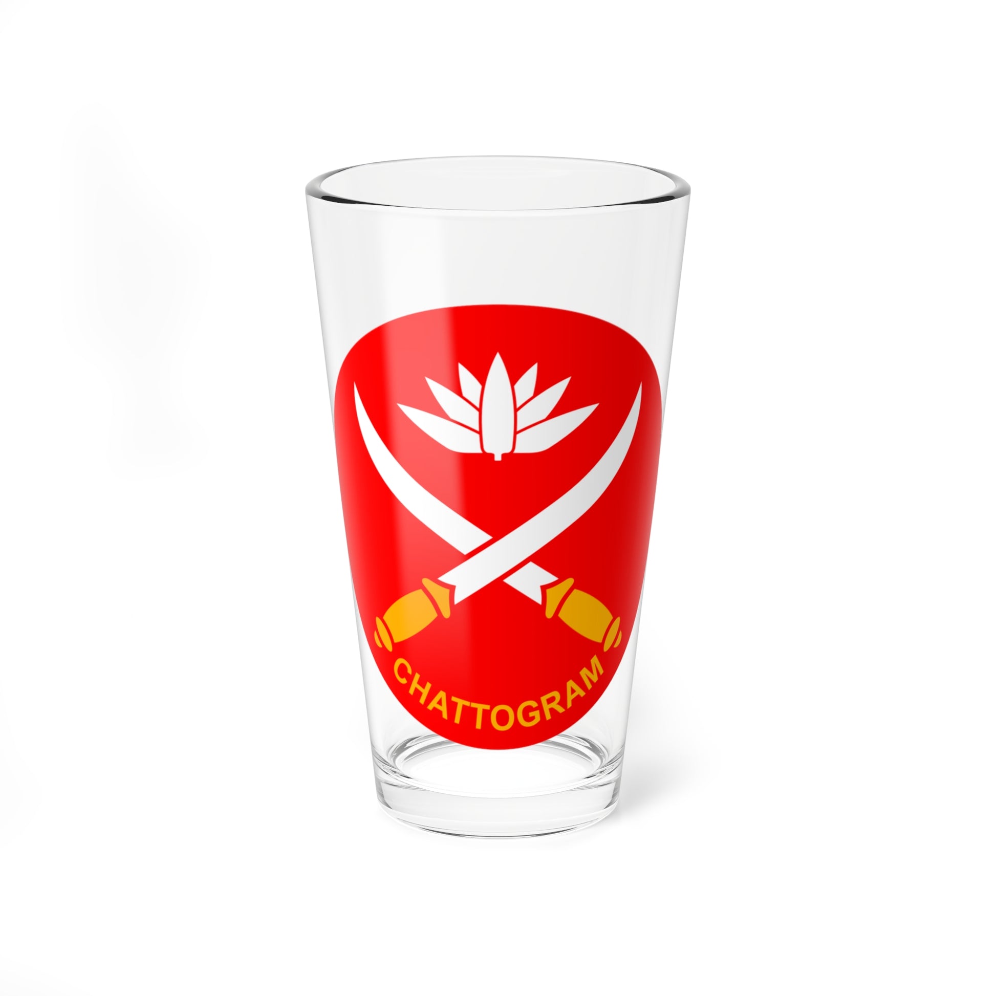 Hey, check out this cool pint glass I found! It's got the super official Seal of the Station Headquarters Chattogram Cantonment (Bangladesh) right on it. This cantonment is like the HQ for the Bangladesh Army's 24th Infantry Division. ⚔️ The design features some sweet traditional Bangladeshi symbols like crossed kukris (those curved knives that look like they're ready for action) and water lilies. 🌿 And get this, it's got a glossy finish that's just stunning. 💎 So yeah, like a piece of history in your hands. Perfect for showing off your Bangladeshi pride or sipping on something refreshing after a long day. 😎