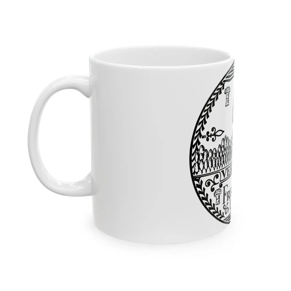 The Seal of Vermont BW refers to the official symbol representing the U.S. state of Vermont. This seal is a heraldic emblem that combines various elements significant to the state's history, culture, and identity. It features an image of a farmer and a sheep on either side of a tree, with a three-masted ship at the bottom. The shield is topped by a helmet and crest depicting a rising sun. The seal serves as a testament to Vermont's agricultural roots, nautical history, and natural beauty. It embodies the state's motto, "Freedom and Unity," reflecting the spirit of independence and unity that defines Vermont.