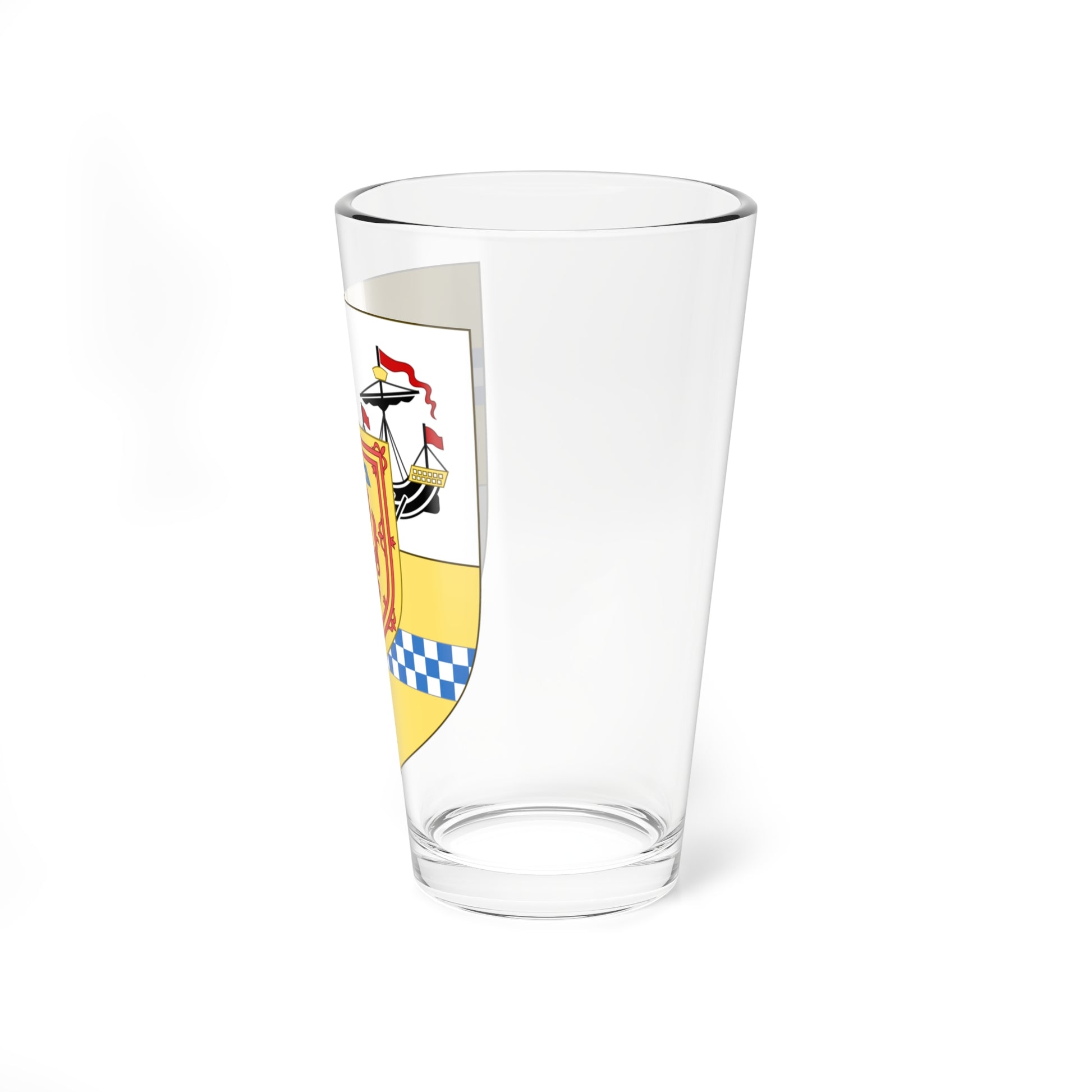 This pint glass is pure royalty! It features the dazzling coat of arms of the Duke of Rothesay, a bigwig in the United Kingdom. Talk about a statement piece! I mean, just look at that shield – it's like a mini-castle with a fancy crest on top. It's like a medieval treasure you can hold in your hand. Perfect for showing off your royal side at a fancy party or for enjoying your favorite brew in true aristocratic style.