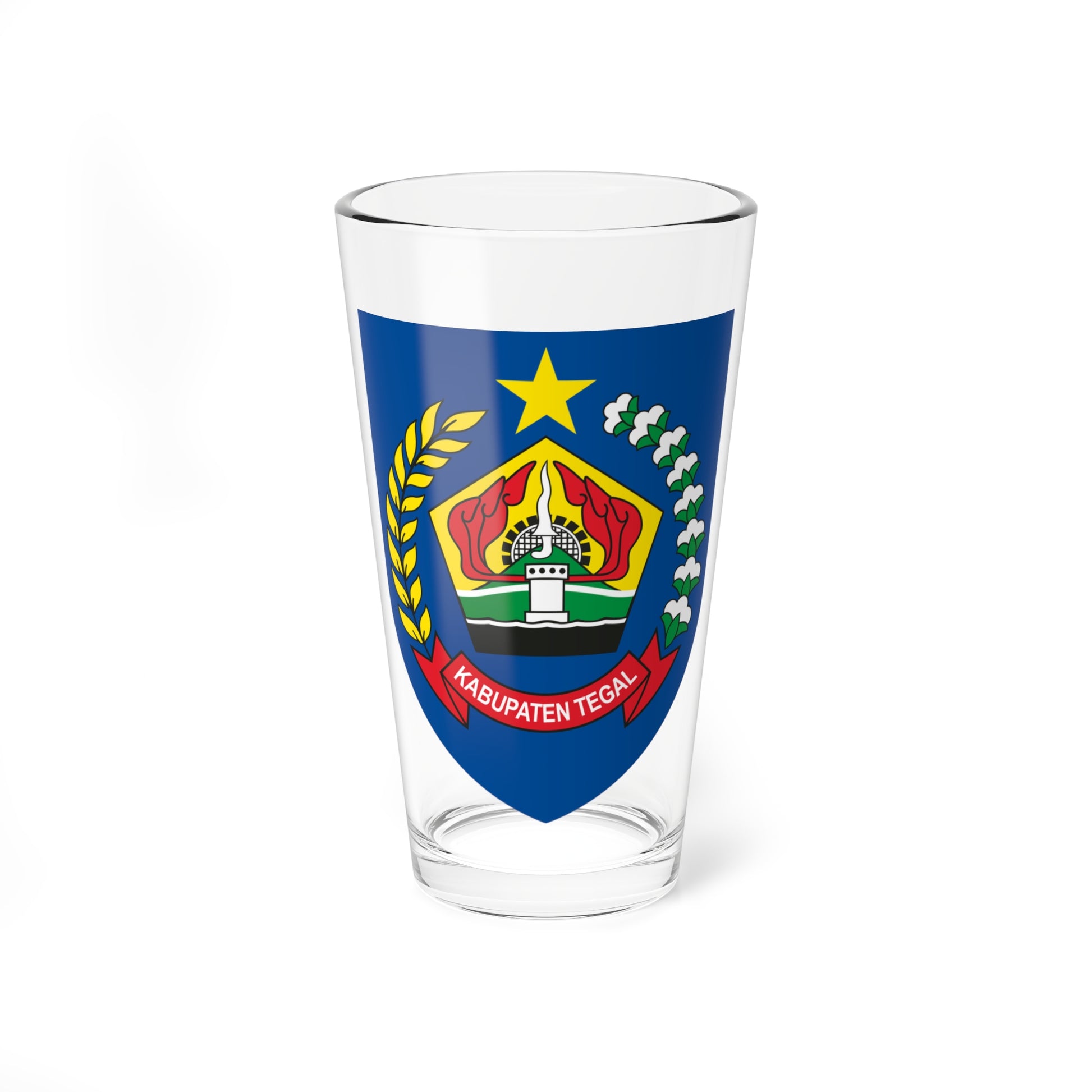 Celebrate the heritage of Tegal Regency, Indonesia, with this intricately designed pint glass, showcasing its official Coat of Arms, often referred to as the "Shield of Tegal Regency." The artwork on this glass captures the essence of this symbolic emblem.