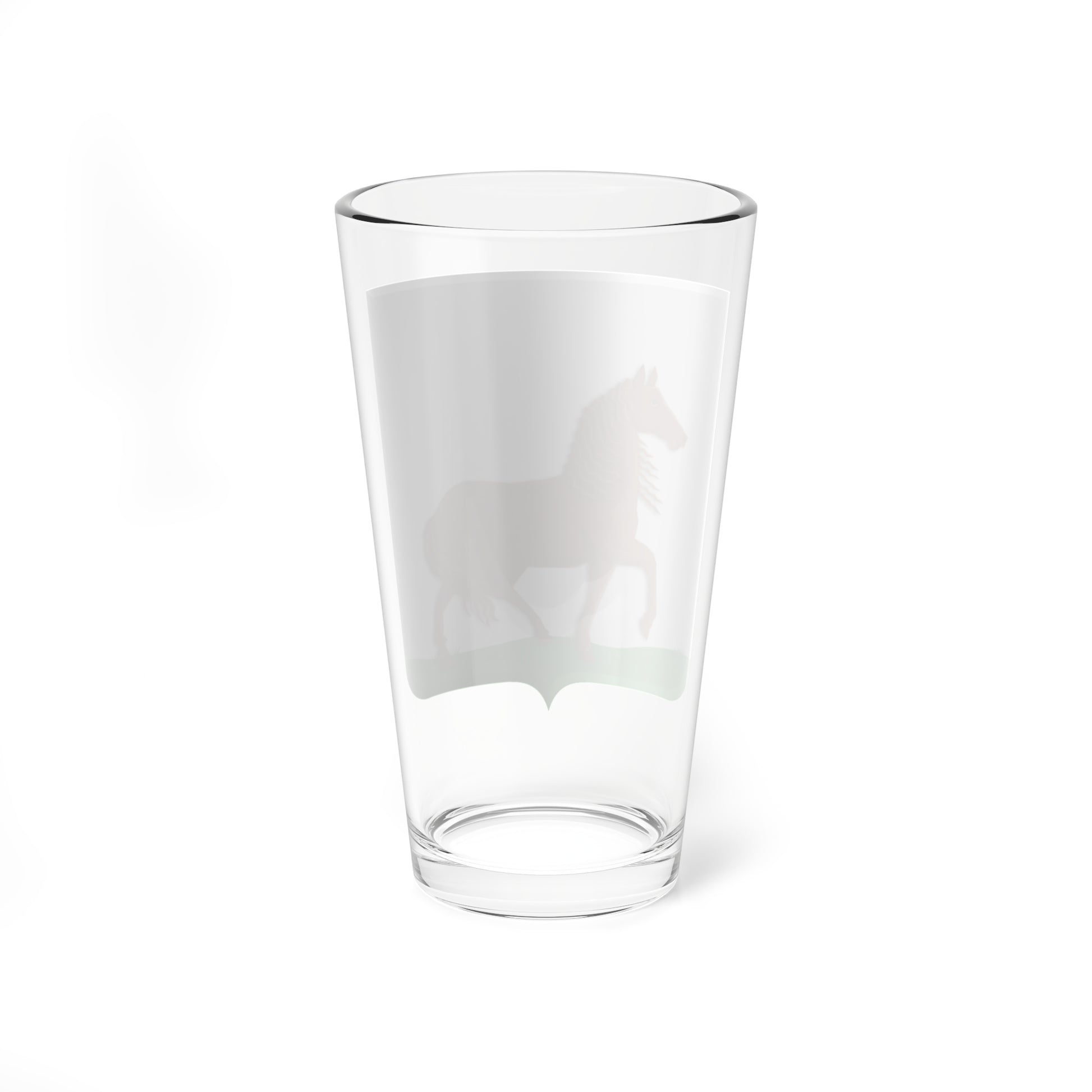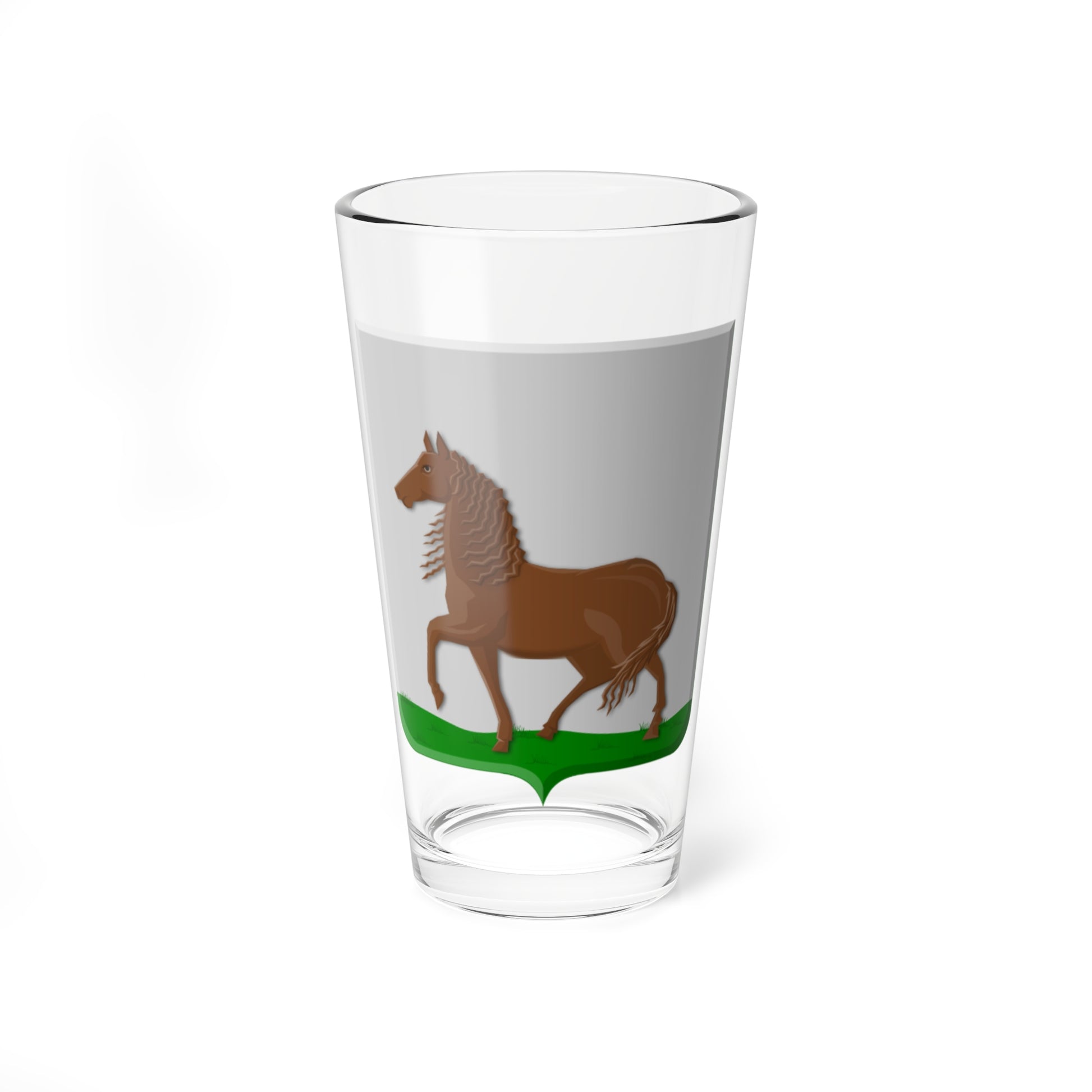This pint glass showcases the iconic coat of arms of Sint Pancras, a former municipality in North Holland, Netherlands. The central focus of the design is a dynamic representation of a galloping brown horse.