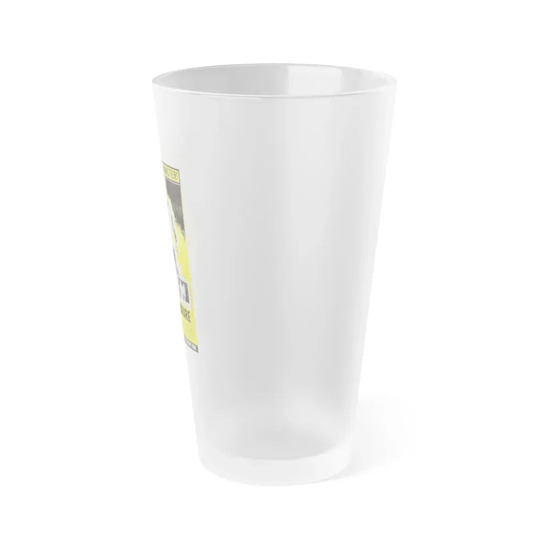 Frosted pint glass (16 oz / ≈0.47 L) with a soft matte finish and semi-translucent, one-sided print. Tough enough for bar and restaurant use, dishwasher safe, and BPA-free — a modern take on classic pintware.