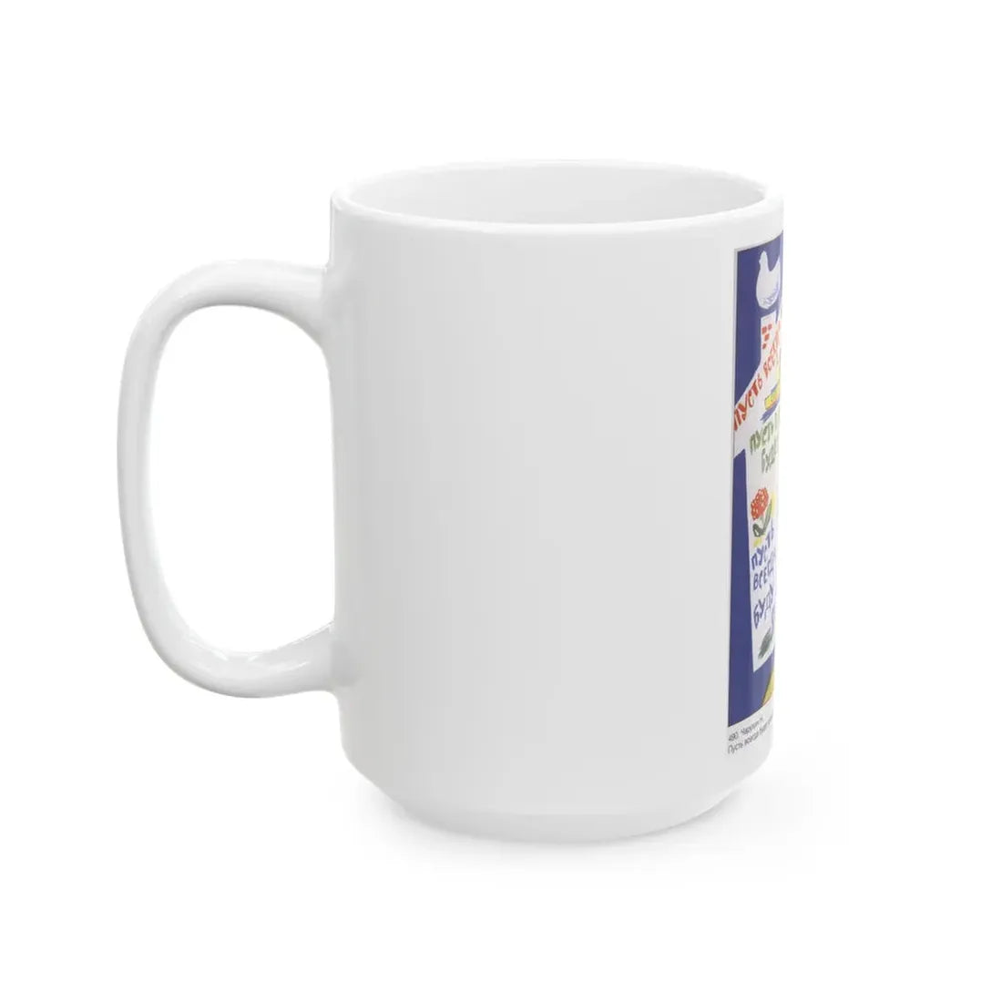 Sturdy white ceramic mugs available in 11 oz (≈330 ml) and 15 oz (≈440 ml), with a glossy finish and comfortable C-handle — microwave and dishwasher safe, and made from lead- and BPA-free materials.