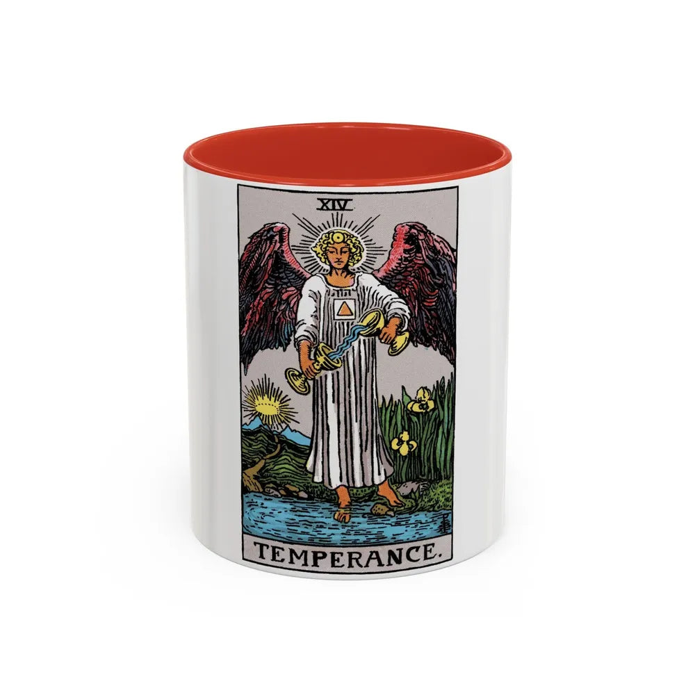 Temperance (Tarot Card) The Temperance tarot card is the fourteenth major arcana card within a standard Tarot deck. It represents balance, harmony, moderation, and self-restraint. This card often symbolizes the need for integration of inner dualities, such as the conscious mind and the subconscious, emotions and reason, or body and spirit. The Temperance card also signifies the blending of seemingly opposing forces, like water and fire, to create a harmonious whole. Its imagery typically features an angel-like figure pouring liquid from one container into another while straddling a river or stream. Interpretations of this card in a tarot reading can vary widely based on the surrounding cards and the reader's intuition.
