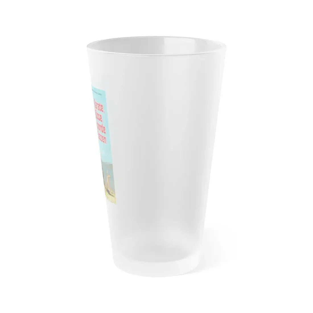 Frosted pint glass (16 oz / ≈0.47 L) with a soft matte finish and semi-translucent, one-sided print. Tough enough for bar and restaurant use, dishwasher safe, and BPA-free — a modern take on classic pintware.
